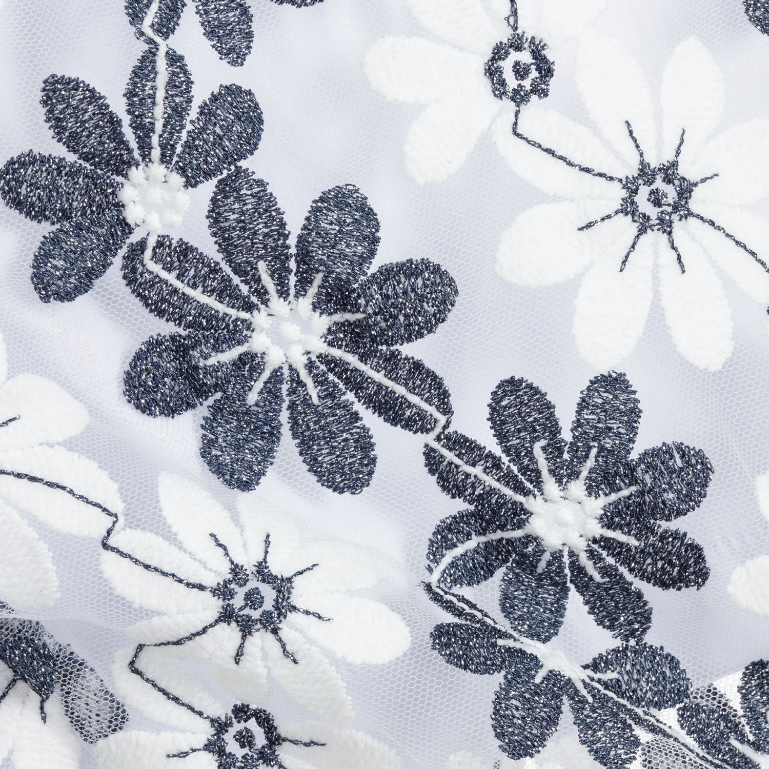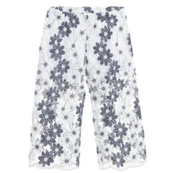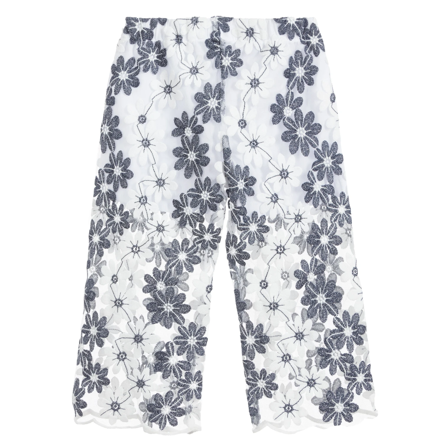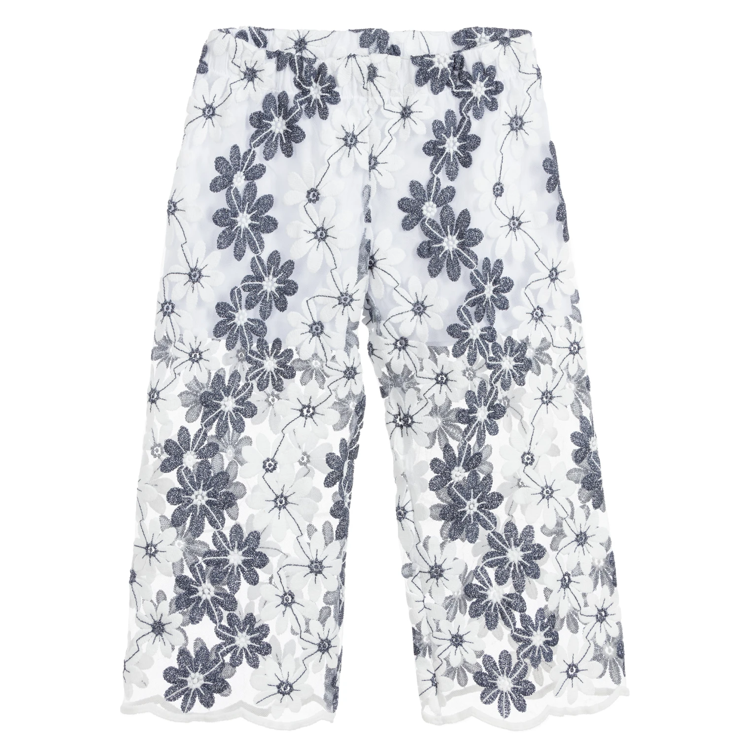 Navy blue and white, floral lace and tulle wide-leg trousers for girls by Piccola Ludo. The sheer legs have beautiful sparkly embroidered flowers with scalloped hems. They have a pair of white cotton shorts lining underneath and are mid-calf length.