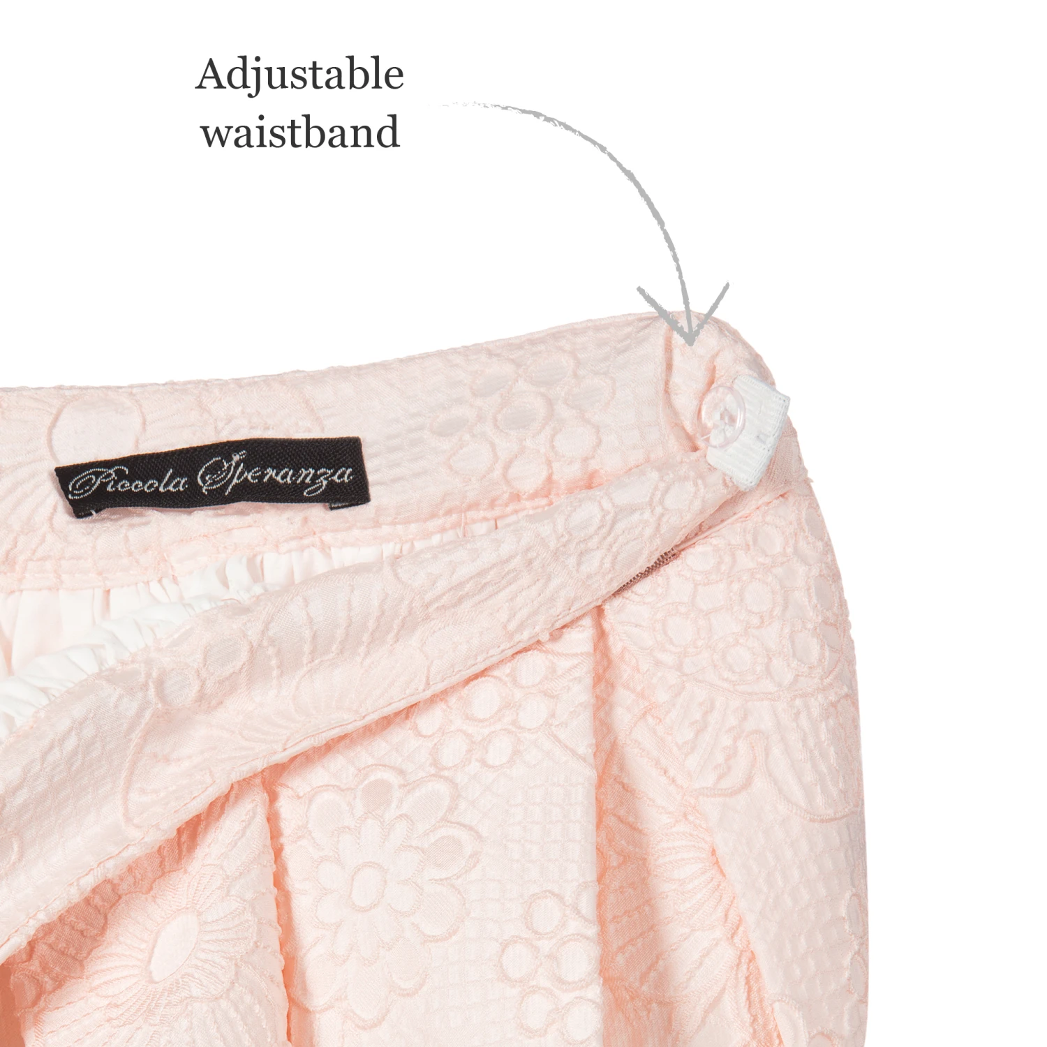 This short, salmon pink brocade skirt by Piccola Speranza has a raised floral design with grosgrain ribbons and bows. It has an adjustable waist, fine cotton lining and the designer’s diamanté logo as a sparkling finishing touch.