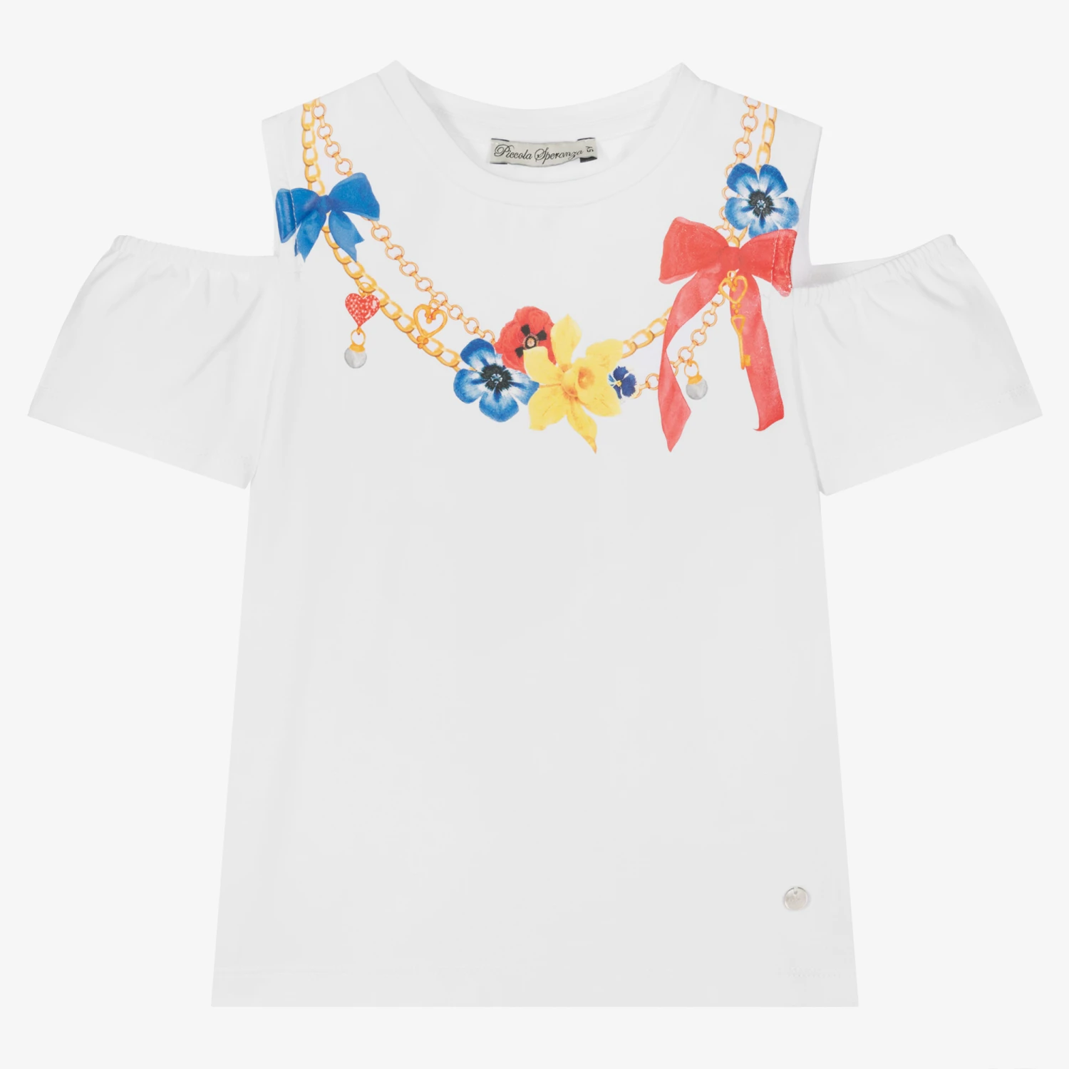 Chic white cotton top for girls from Piccola Speranza, with elasticated cold-shoulder detailing. Ideal for summer wear, it has a gold chain necklace print around the neckline, complete with red, yellow, and blue flowers.