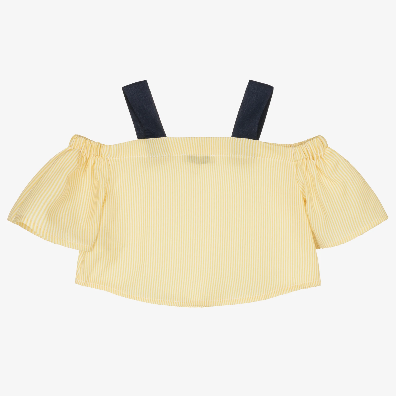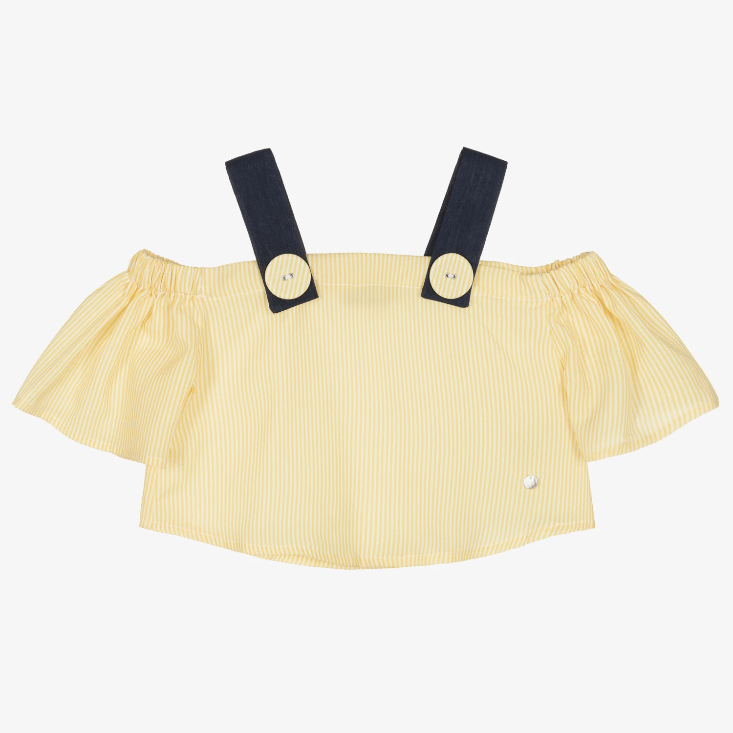 Off-the-shoulder blouse for girls by Piccola Speranza, in yellow and white stripes. Made in silky crêpe with a cropped length, the sleeves have elasticated panels on the sides. It has navy blue fixed shoulder straps with large covered button trims on the front, and a discreet mother-of-pearl logo charm stitched near the hem.