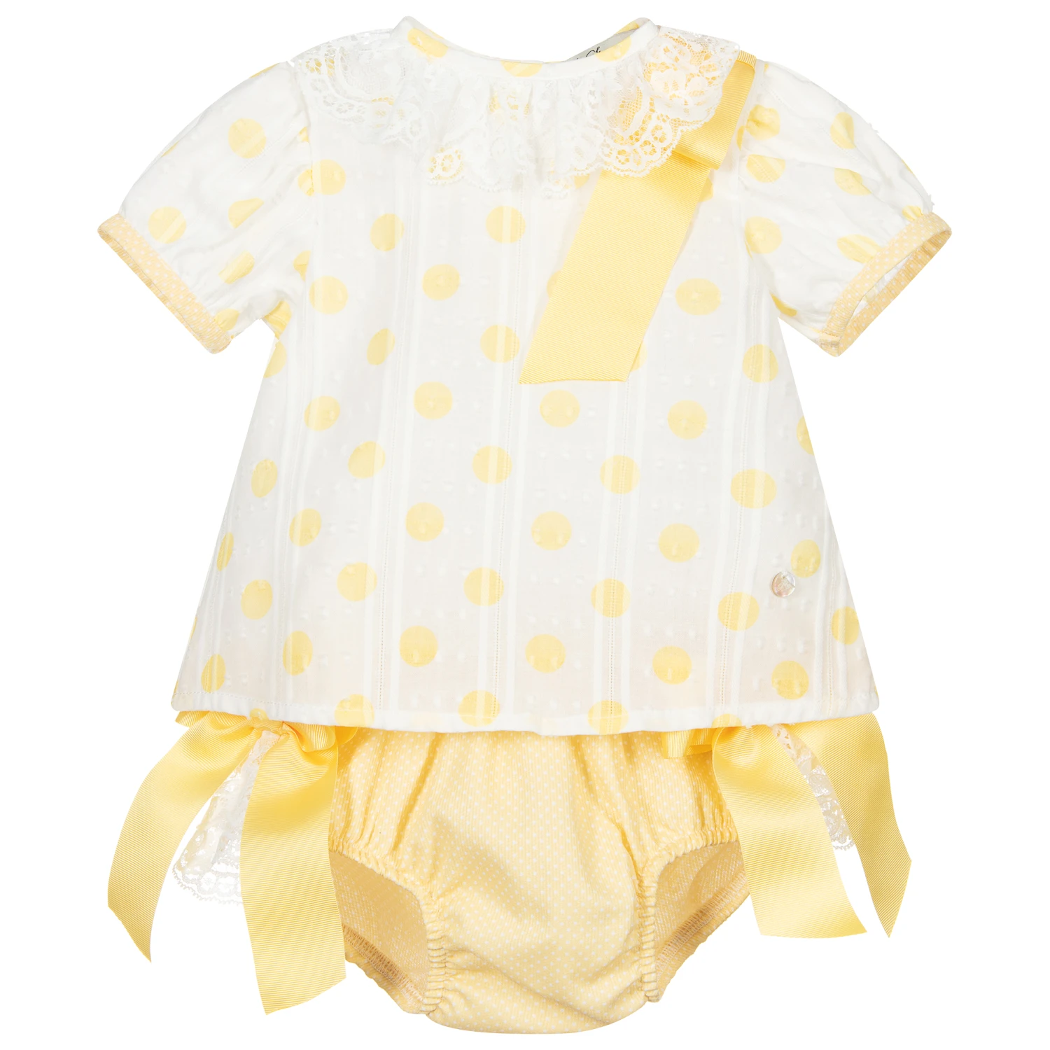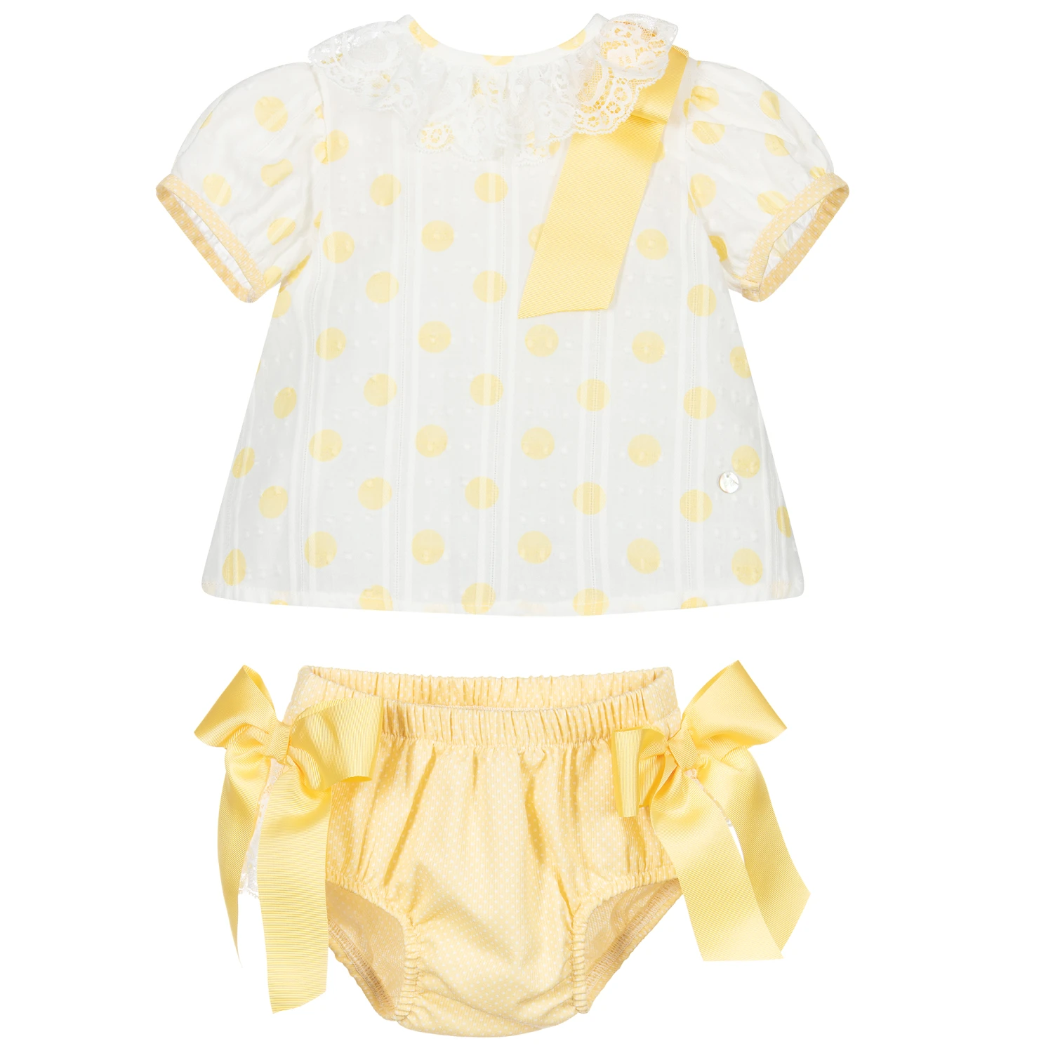 Little girls cotton blouse and shorts set by Piccola Speranza. The lightweight, white top has delicate cut-work embroidery and plumeti tuft embroidery, with yellow polka dot print and a lace collar. There is a large grosgrain ribbon bow on one shoulder, and yellow and white polka dot trim on the sleeves. The yellow shorts have fine white polka dots, lace ruffles on the back, and large ribbon bows either side of the elasticated waistband.