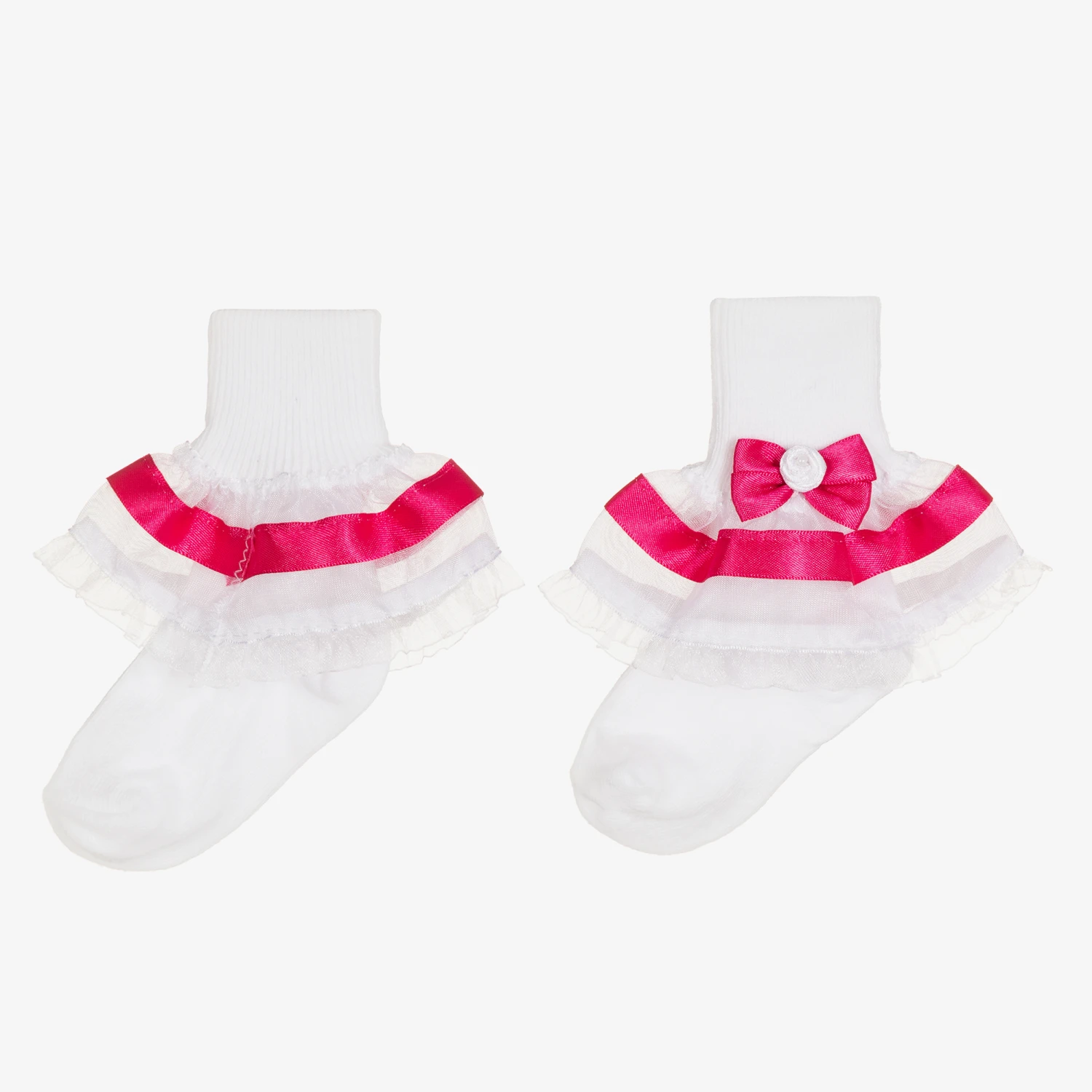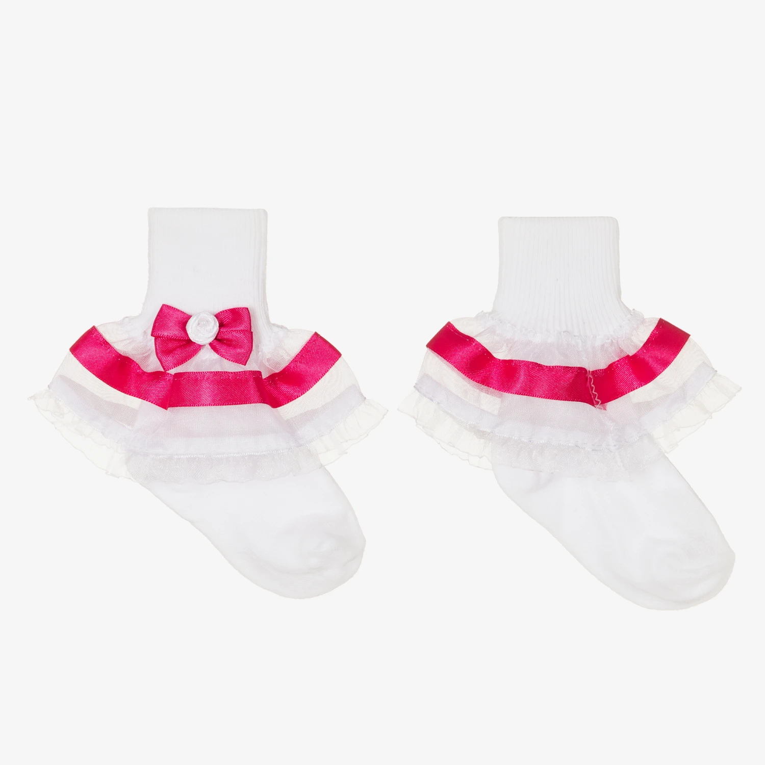 Short white socks for girls by Pretty Originals, with lovely organza frills. Made in a soft cotton blend, they have fuchsia pink satin ribbon trim with a matching bow and white satin rosebud on the sides.