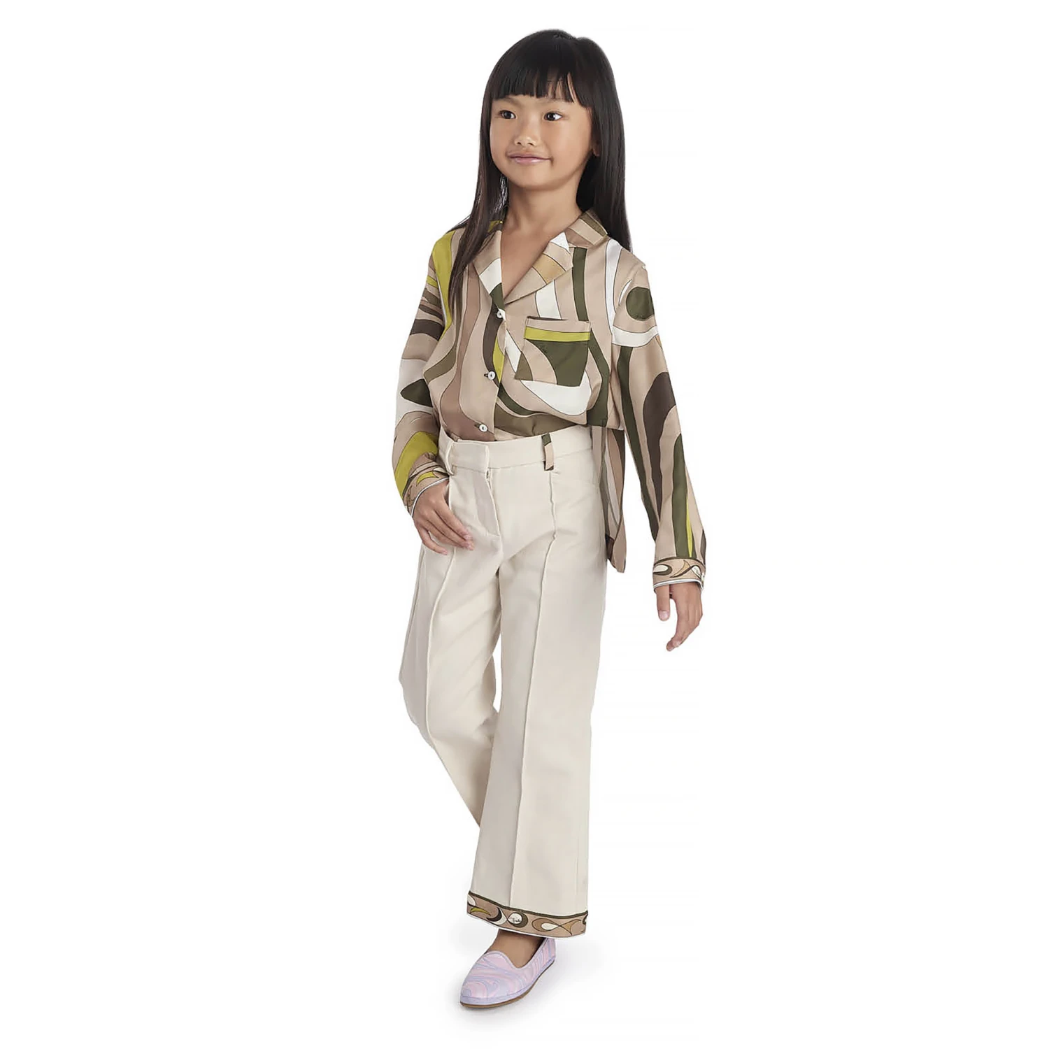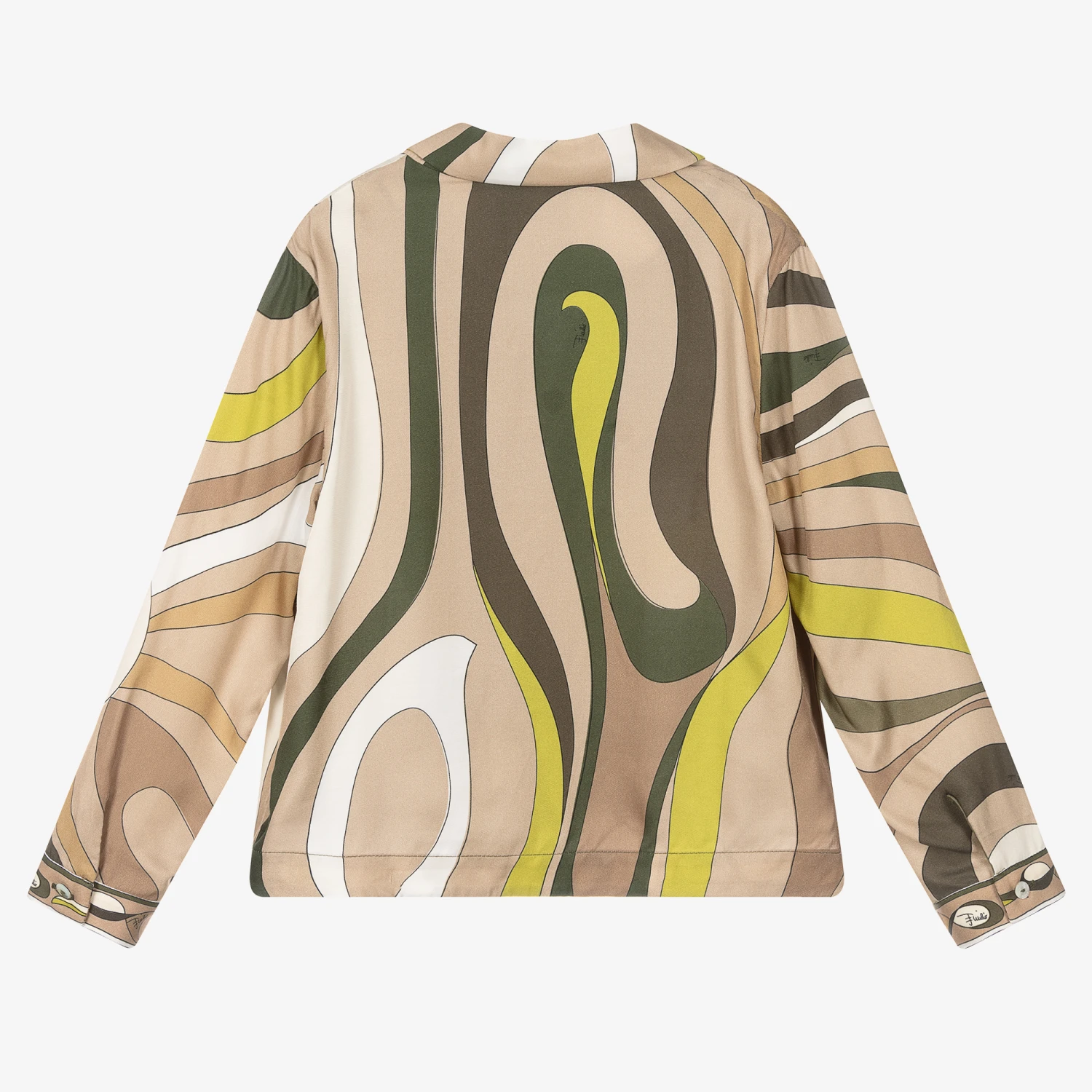 Gorgeous blouse for girls by luxury Italian designer Emilio Pucci, patterned with the brand’s pretty beige and green Marmo print. Silky and lightweight, it has a patch pocket on the chest and stylish open sides, making it ideal as a layering piece. There are logo-branded buttons on the front and the brand’s distinctive Pesci print trims on the cuffs to finish the blouse beautifully.