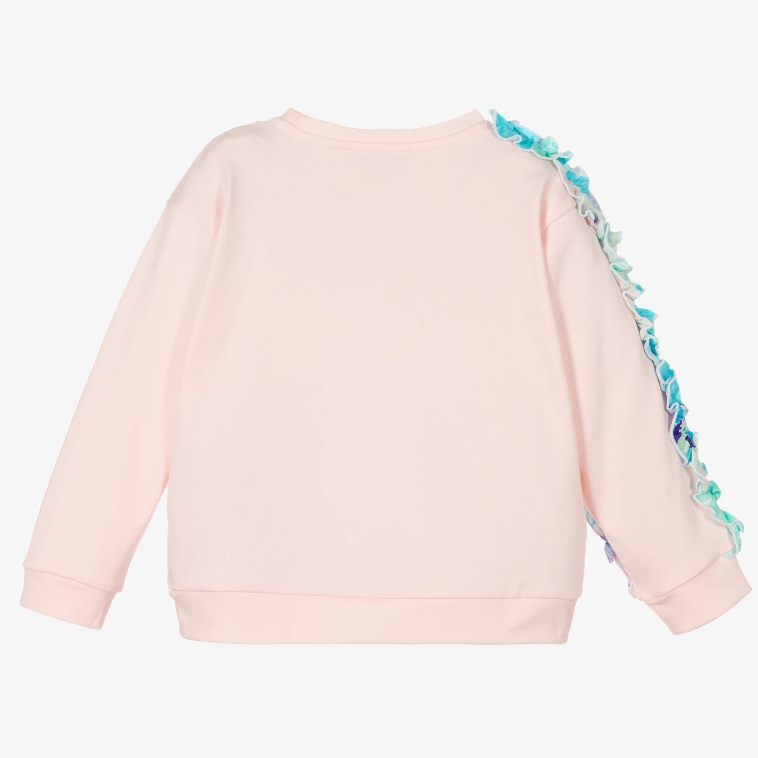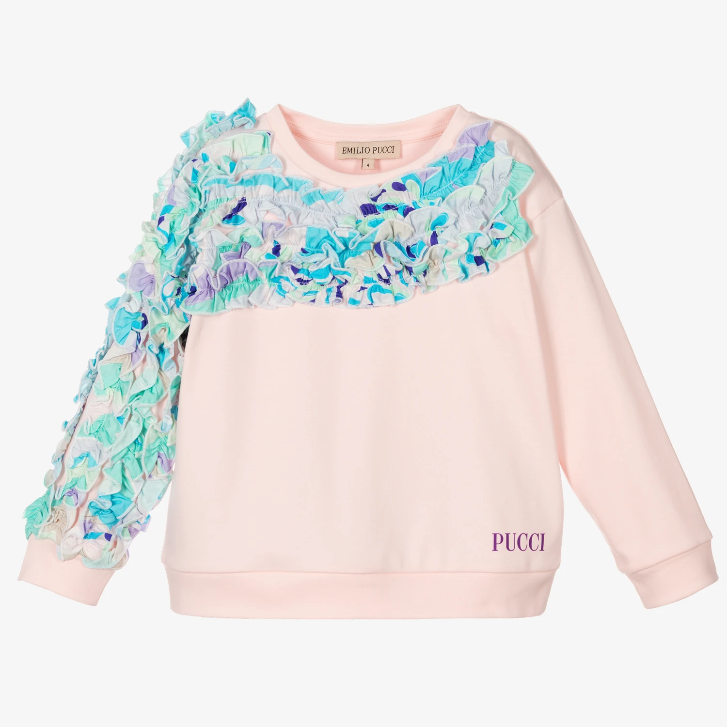 Girls pink sweatshirt by Emilio Pucci. The luxury Italian brand, renowned for its vibrant geometric prints has designed a lightweight cotton jersey sweatshirt with a Lilly print ruffle trim in light blues, greens and purples. There is a purple logo print by the hem.