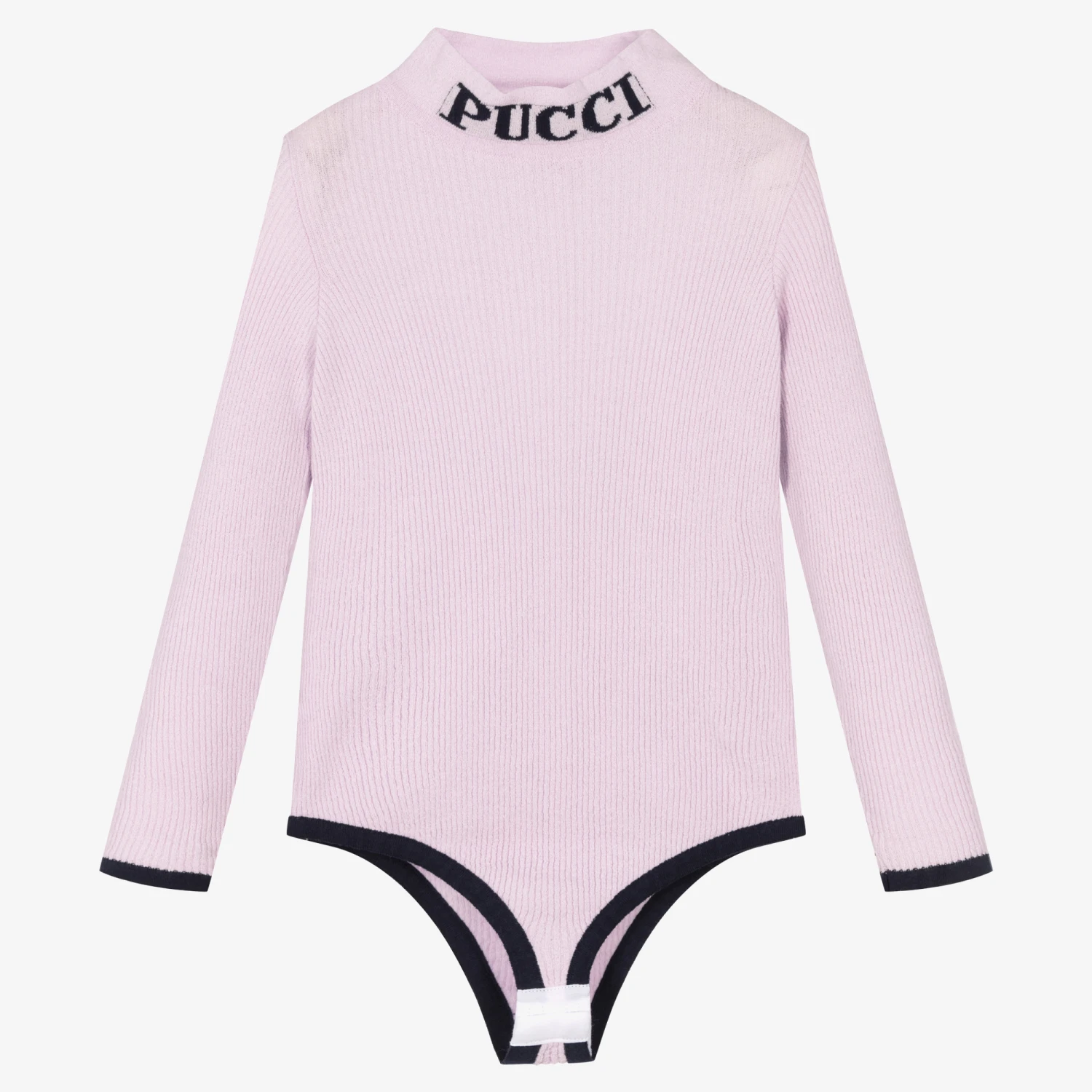 Stylish roll neck top for girls by Italian brand Emilio Pucci, in lilac purple with black trims. It is made in ribbed cotton jersey, in a bodyvest style that secures with hook and eye fastenings between the legs. The neck features a bold black jacquard logo for a statement designer finish.