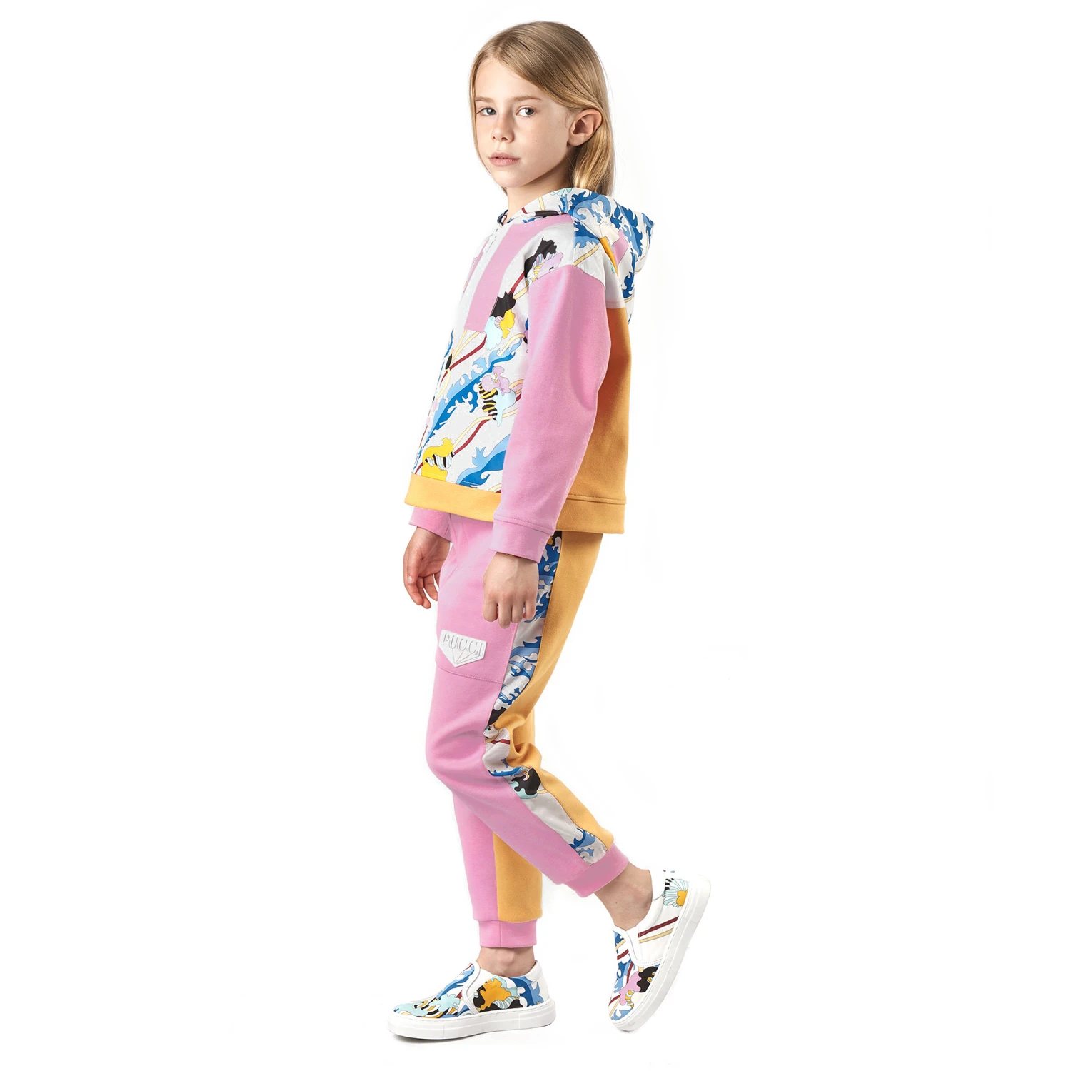 Lovely pink hooded sweatshirt for girls, by luxury Italian brand Emilio Pucci. Made from super soft cotton jersey, it has the brand’s gorgeous blue and yellow tonal Ranuncoli print on silky trims on the front, the back and the hood. Fastening with a white quarter zip, it has contrasting pink and yellow colourblock panels. There is a white rubberised badge with an embossed logo on the back.