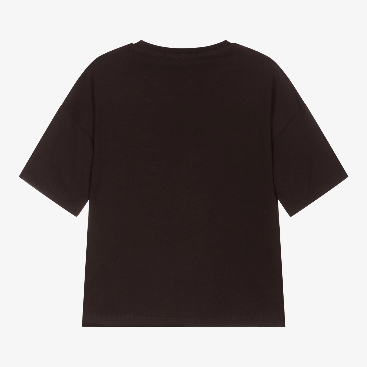Eye-catching, Mini-me black T-shirt for girls from luxury Italian designer, Roberto Cavalli. Made in soft cotton jersey, it has a large beige and black leopard face and a sparkly diamanté ‘C’ in black and gold.