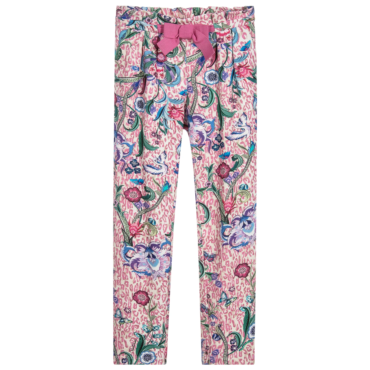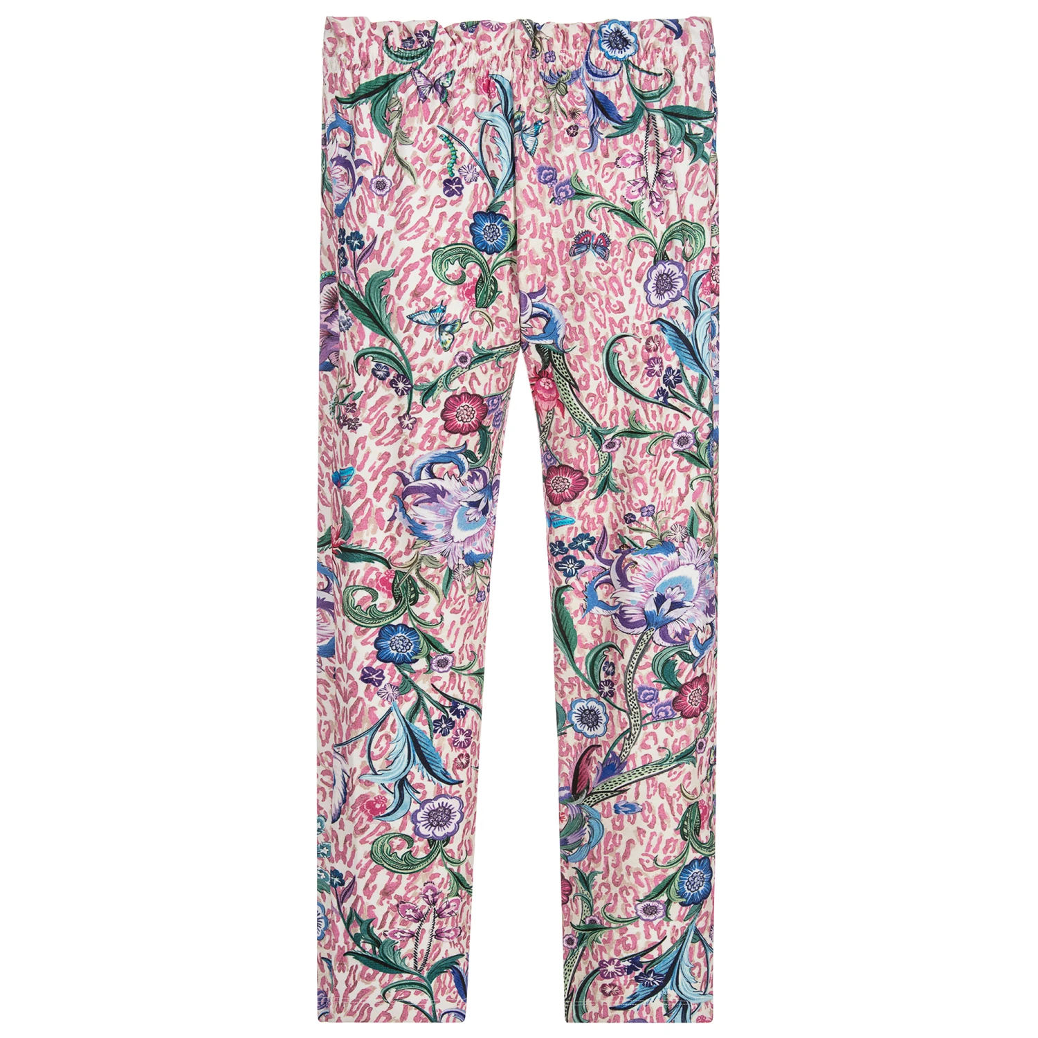 Exotic flora, butterflies and a pink animal print, decorate these fabulous ‘Ocelot Flower’ trousers for girls by Roberto Cavalli. Made in soft, stretchy jersey with a pleated, elasticated waistband for a comfortable fit.