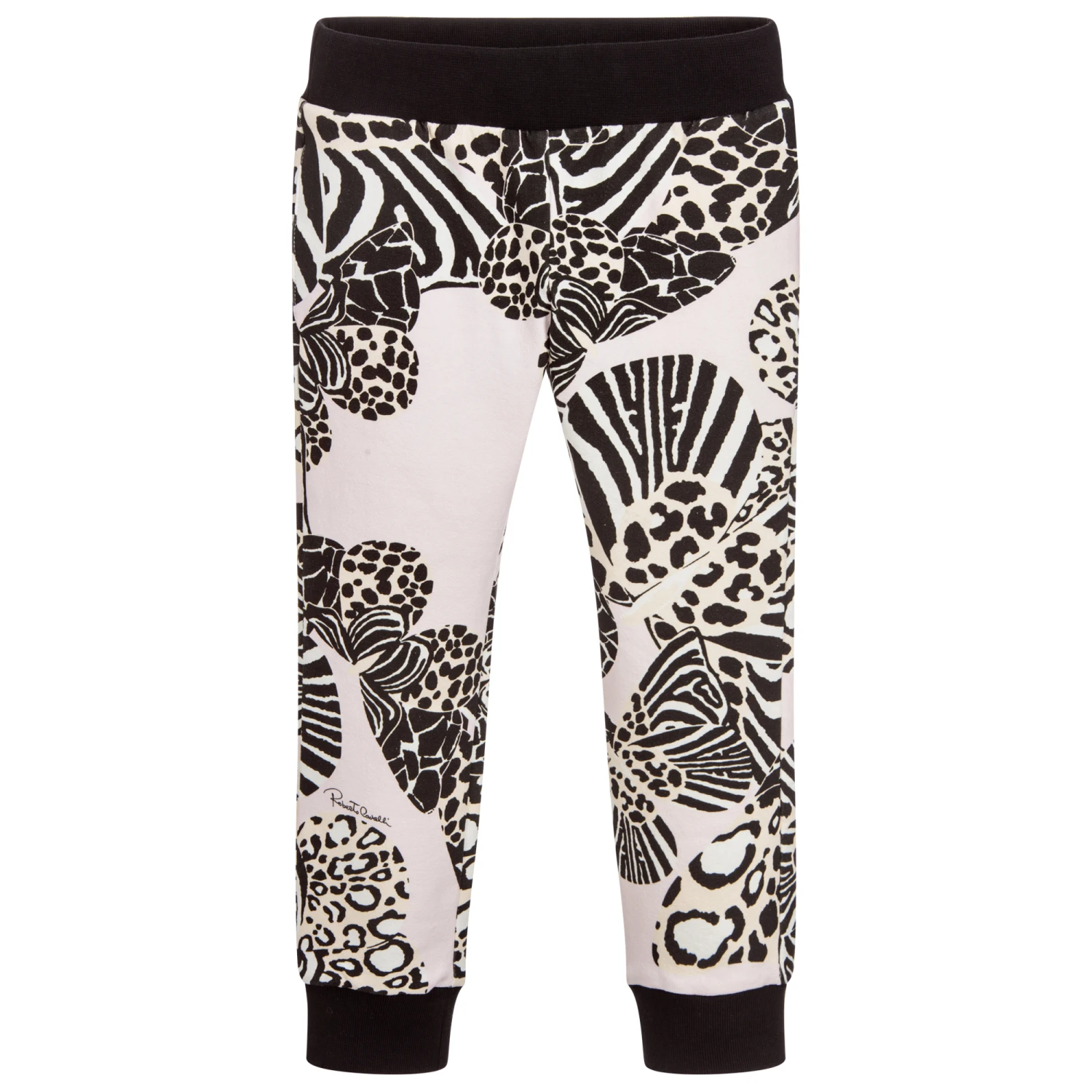 Pale pink and black joggers for girls by Roberto Cavalli, patterned with various animal prints. Made in soft cotton jersey, they have an elasticated waist and ribbed trims.