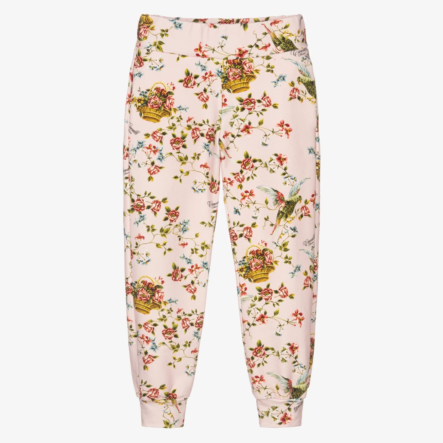 Pink joggers for girls by luxury brand Roberto Cavalli, made in soft cotton jersey. It is patterned in a lovely print of birds and flowers in red, green and blue. The waistband is elasticated and there are side seam pockets.