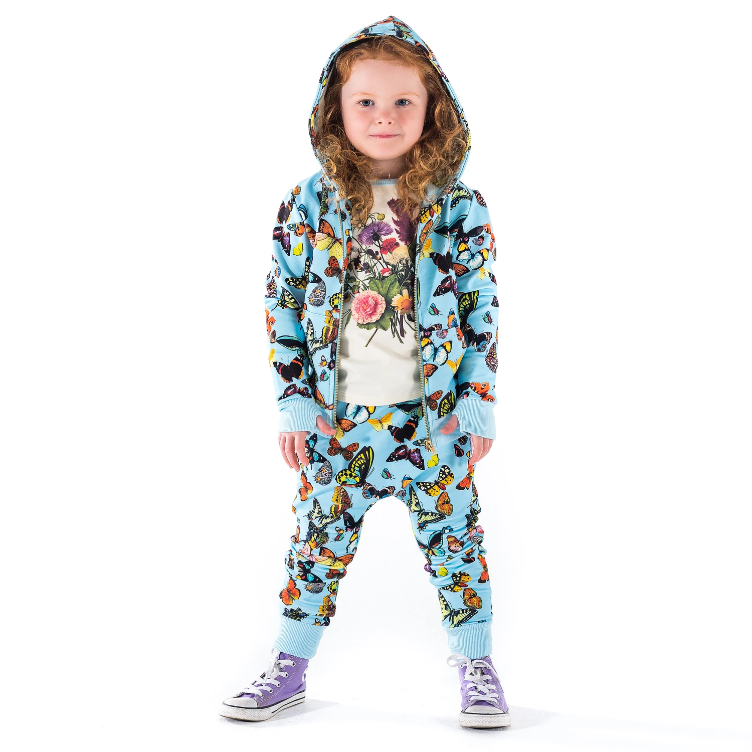 Blue hooded zip-up for girls by Rock Your Baby, patterned with colourful butterflies. Made in soft cotton jersey, it has ribbed trims and front pouch pockets. There is an exposed gold zip fastening on the front.