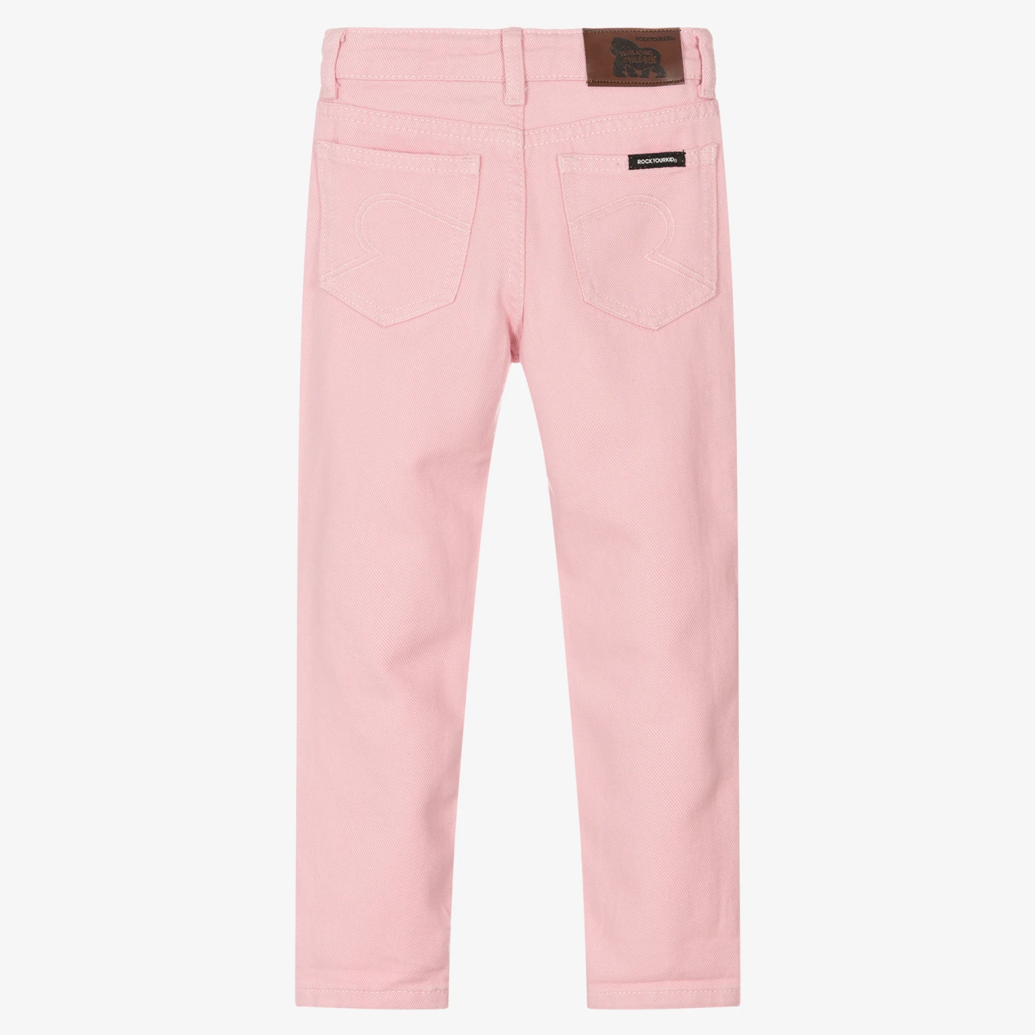 Ultra cool pink jeans for girls by Rock Your Body, made in mid-weight cotton drill. They have stylish rips on the front, with an embroidered logo appliqué. There are also logo details on the back by the beltloop and back pocket. This classic five pocket style fastens easily with a zip and popper and has an adjustable waist for a good fit.