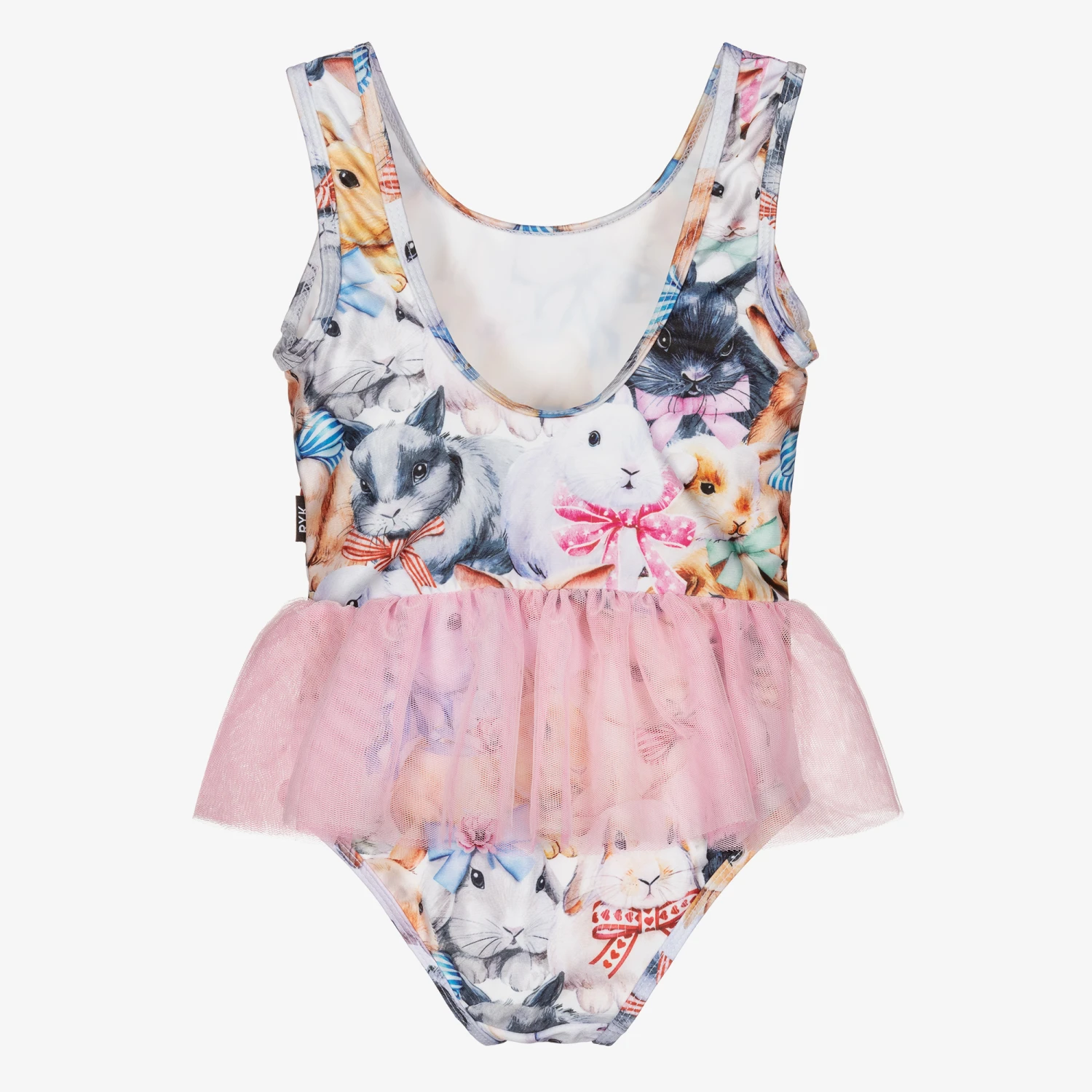 Girls pink and white swimsuit by Rock Your Baby, with a colourful ‘Bunny Bows’ print. Made from smooth and stretchy recycled polyester, it is fully lined and has pretty pink tulle ruffles around the waist.