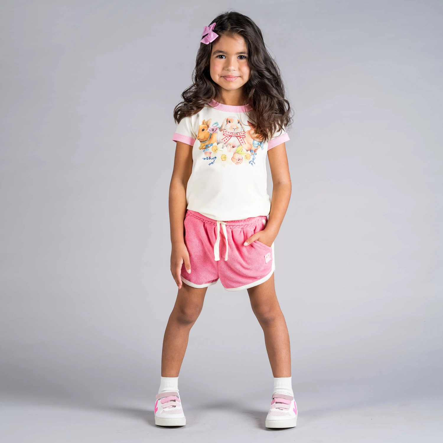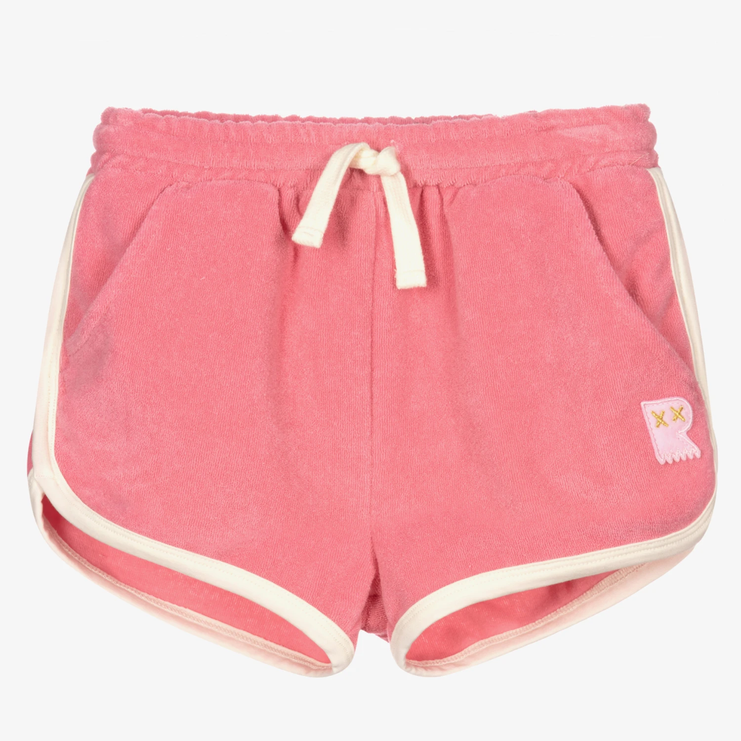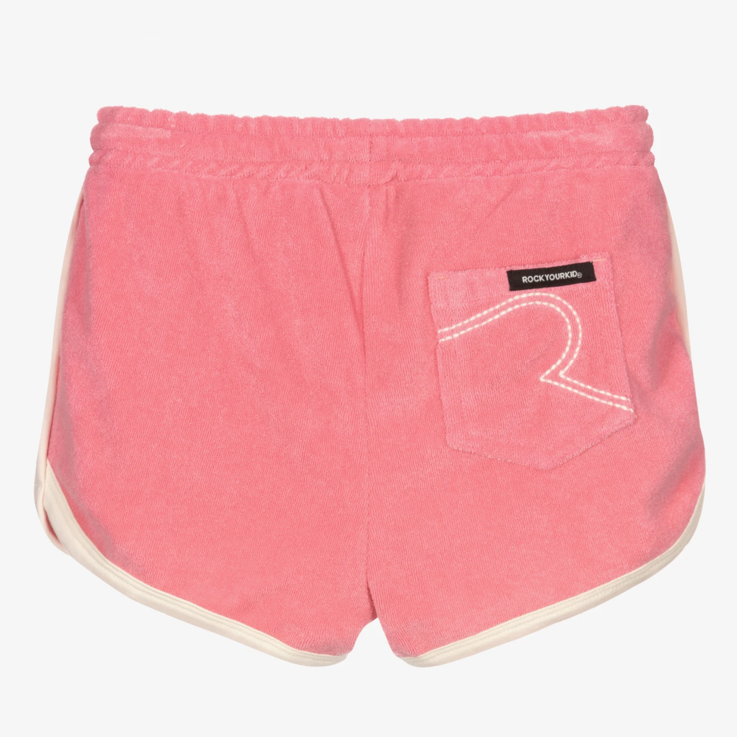 Pink shorts for girls by Australian brand Rock Your Baby. Made in lightweight cotton towelling, they have an ivory drawstring, matching trims and a contrasting pink logo badge on one side. They have jetted side pockets and an embroidered ivory logo with a black logo ab on the back pocket.