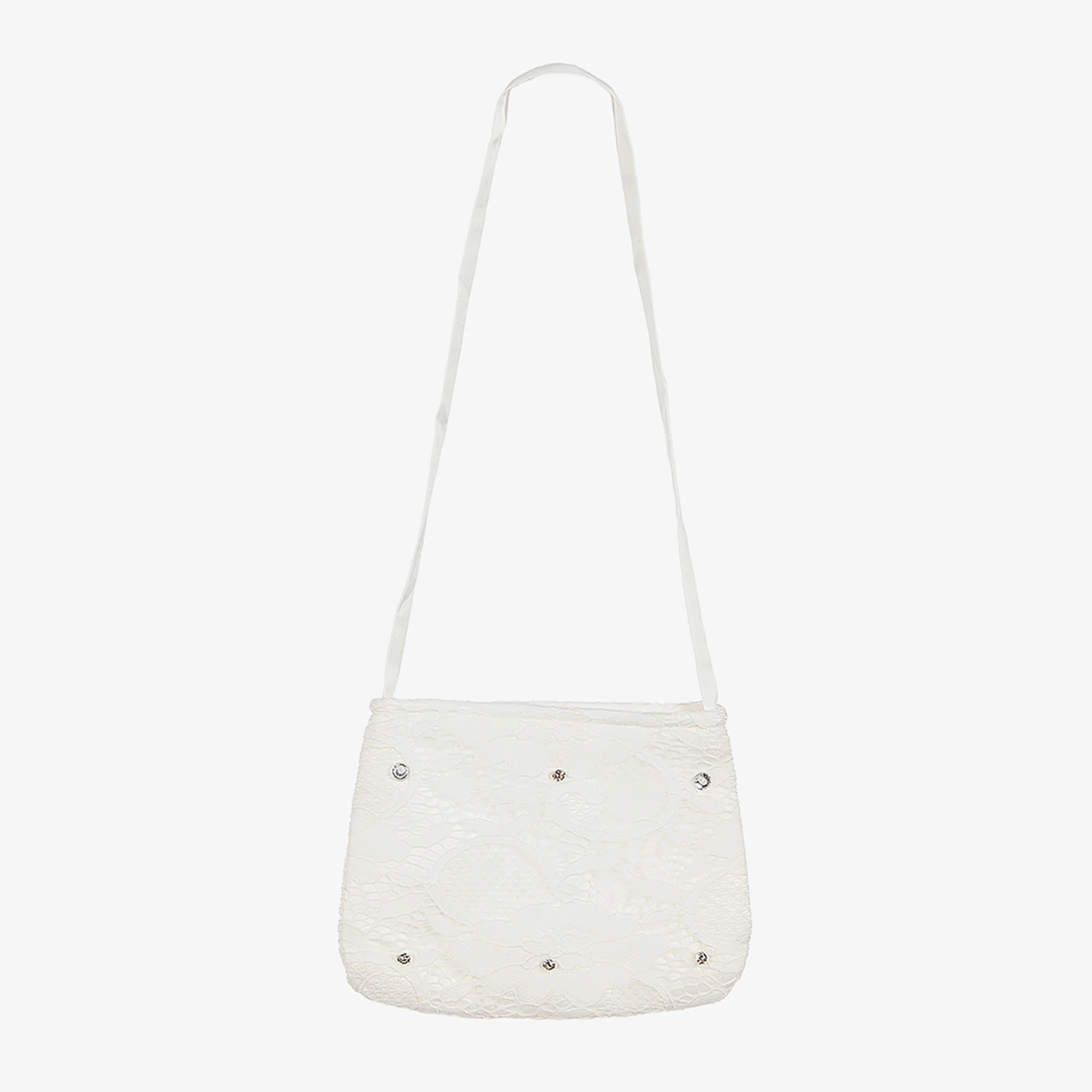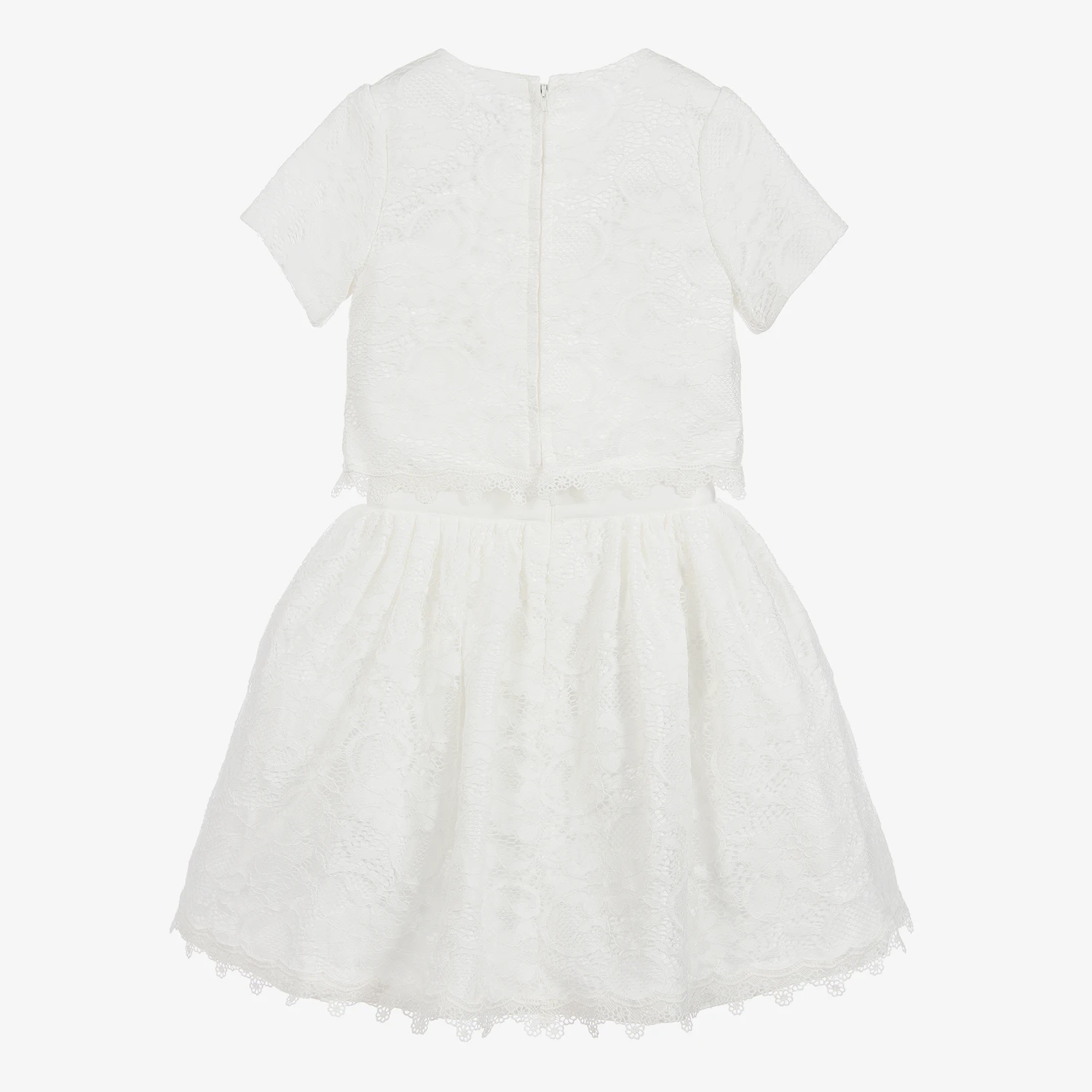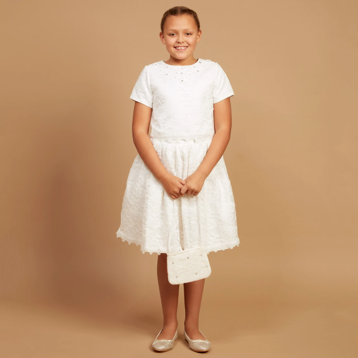 This three piece set by Romano Princess consists of an ivory top, skirt and handbag in intricate floral lace. The top and handbag are embellished with exquisite pearl beads and diamante, and the skirt is flared with soft pleating and tulle on the inside satin lining.