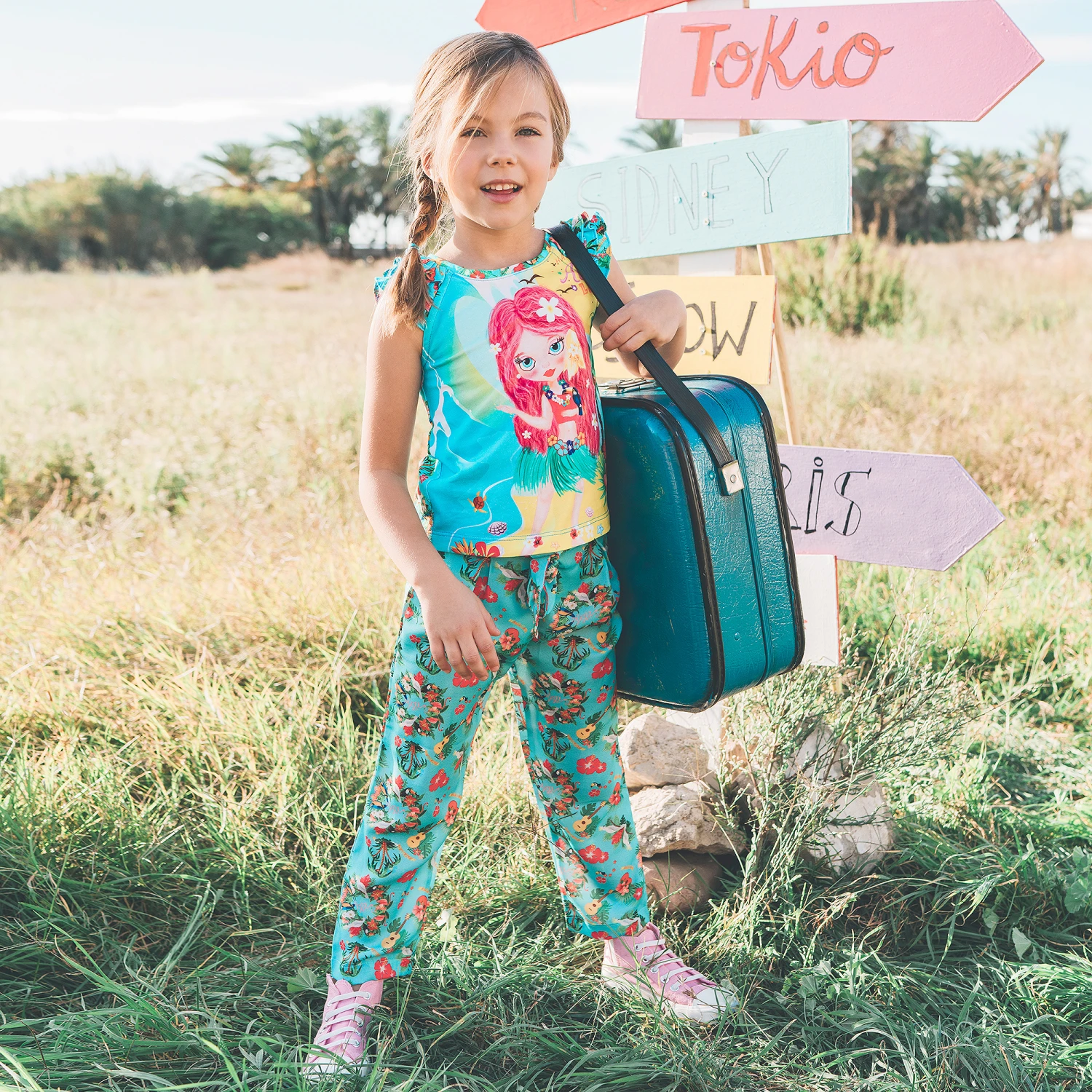 Loose-fitting, turquoise blue trousers for girls by Rosalita Senoritas. Made in silky polyester, they have a pink and yellow Hawaiian print of birds, flowers and guitars. The waistband is elasticated around the back and has a sash around the front.