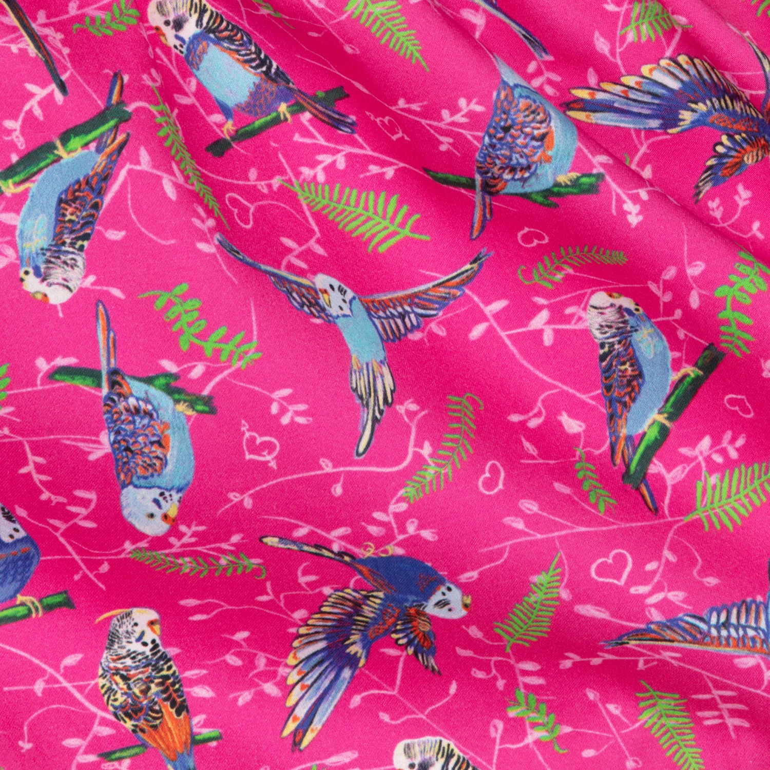 Fuchsia pink cotton dress for girls by Rosalita Senoritas, with a blue and green budgie print. Soft and lightweight, this easy-wear style has an elasticated waist and shaped hem. Neon pom-pom trim in pink and green adds a cool beach dress vibe.