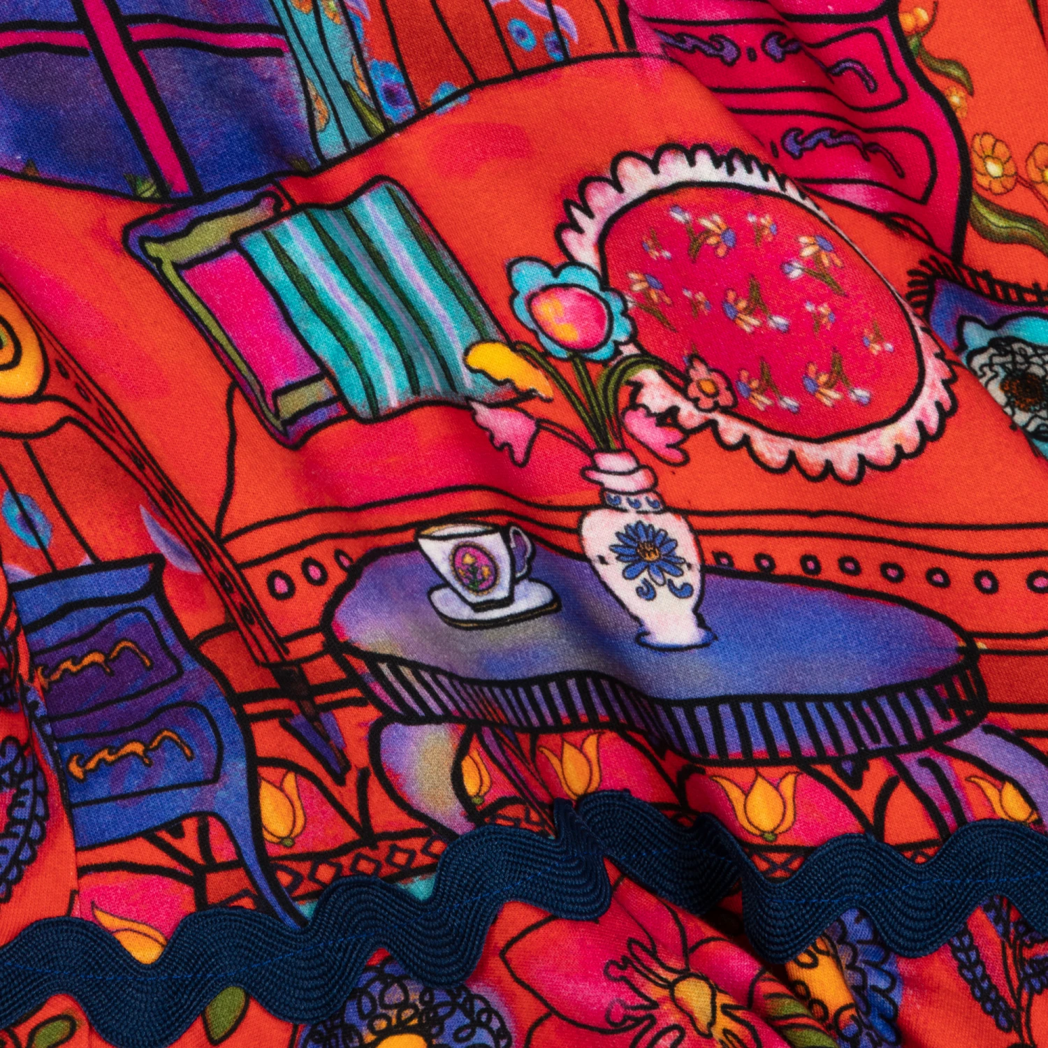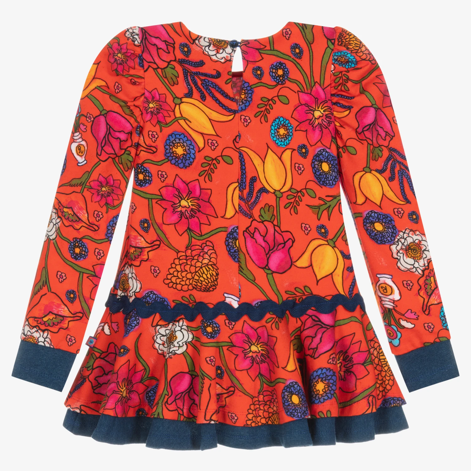 Dark orange cotton jersey dress for girls by Rosalita Senoritas. Soft and comfortable, this puffed-sleeve dress has a whimsical tea party scene, with flowers in vases, floral curtains and a cup and saucer. There are beautiful floral prints on the sleeves, back and frilled skirt. The dropped waist is trimmed with navy blue ric rac, and the hem and cuffs are made in contrast blue denim-effect jersey.