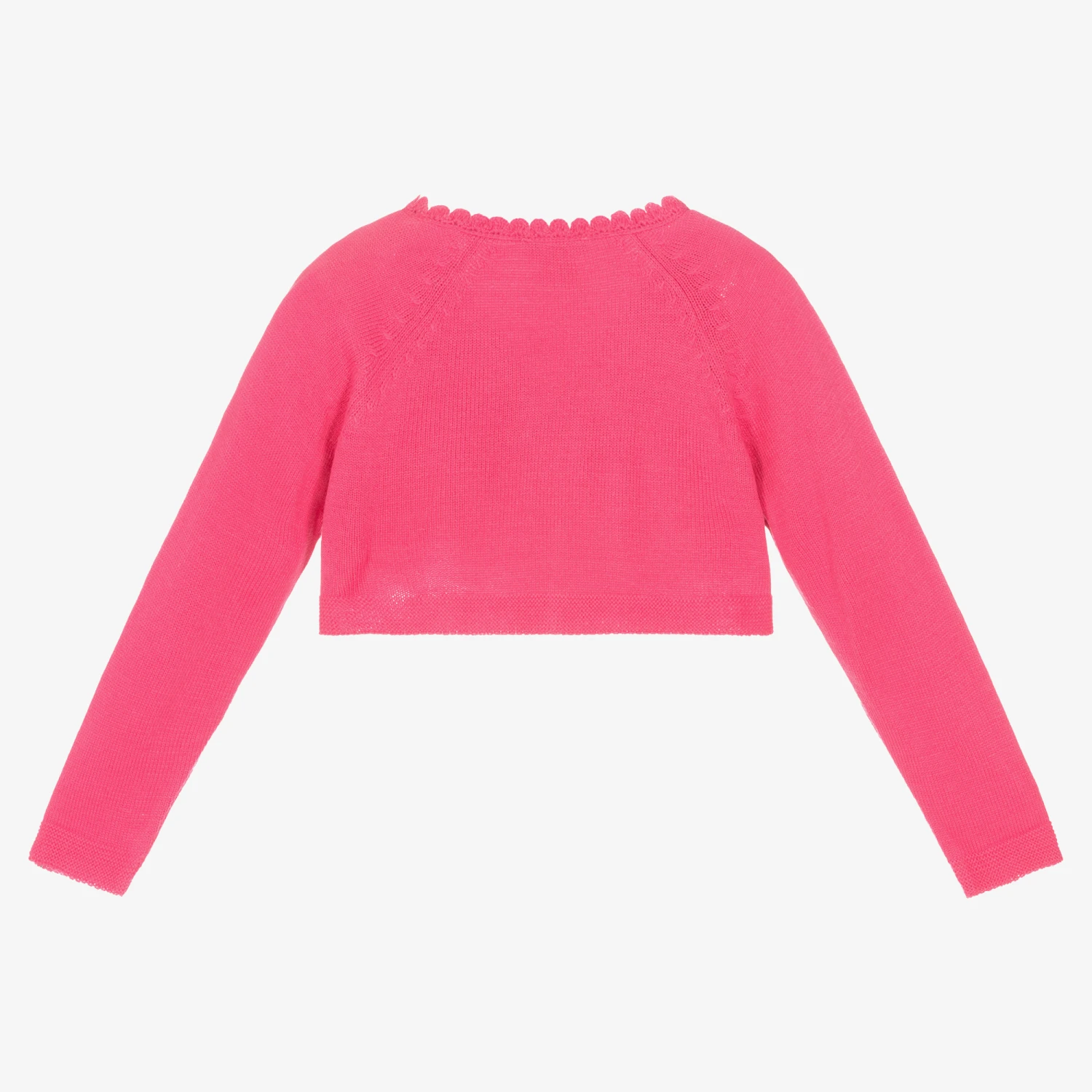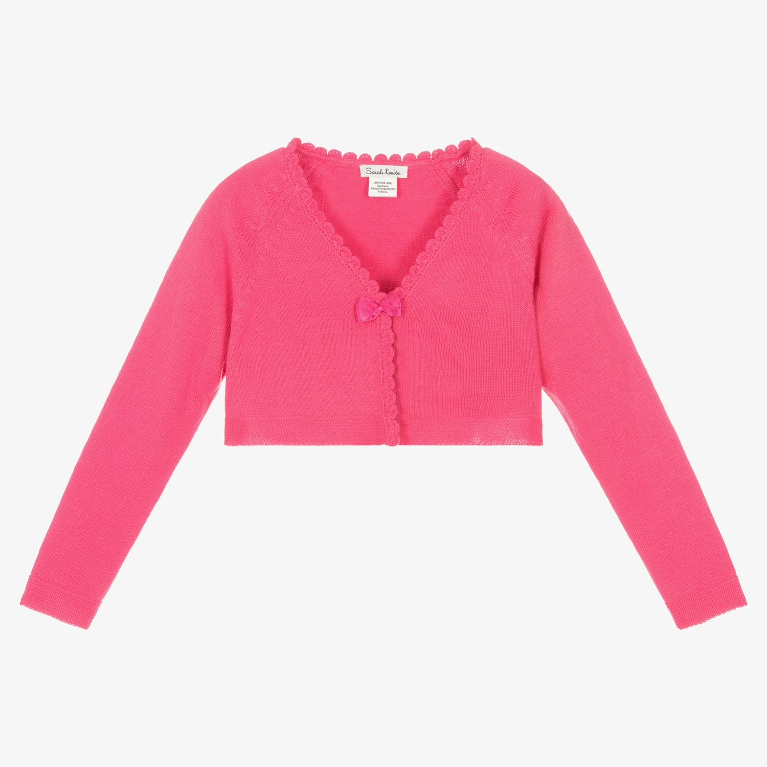 Fuchsia pink bolero for girls by Sarah Louise, crafted from a soft and lightweight knit. This long sleeve cardigan has scalloped trims and a fixed bow detail for a beautiful finish. Ideal for layering, it fastens with a concealed pearlised button on the front.