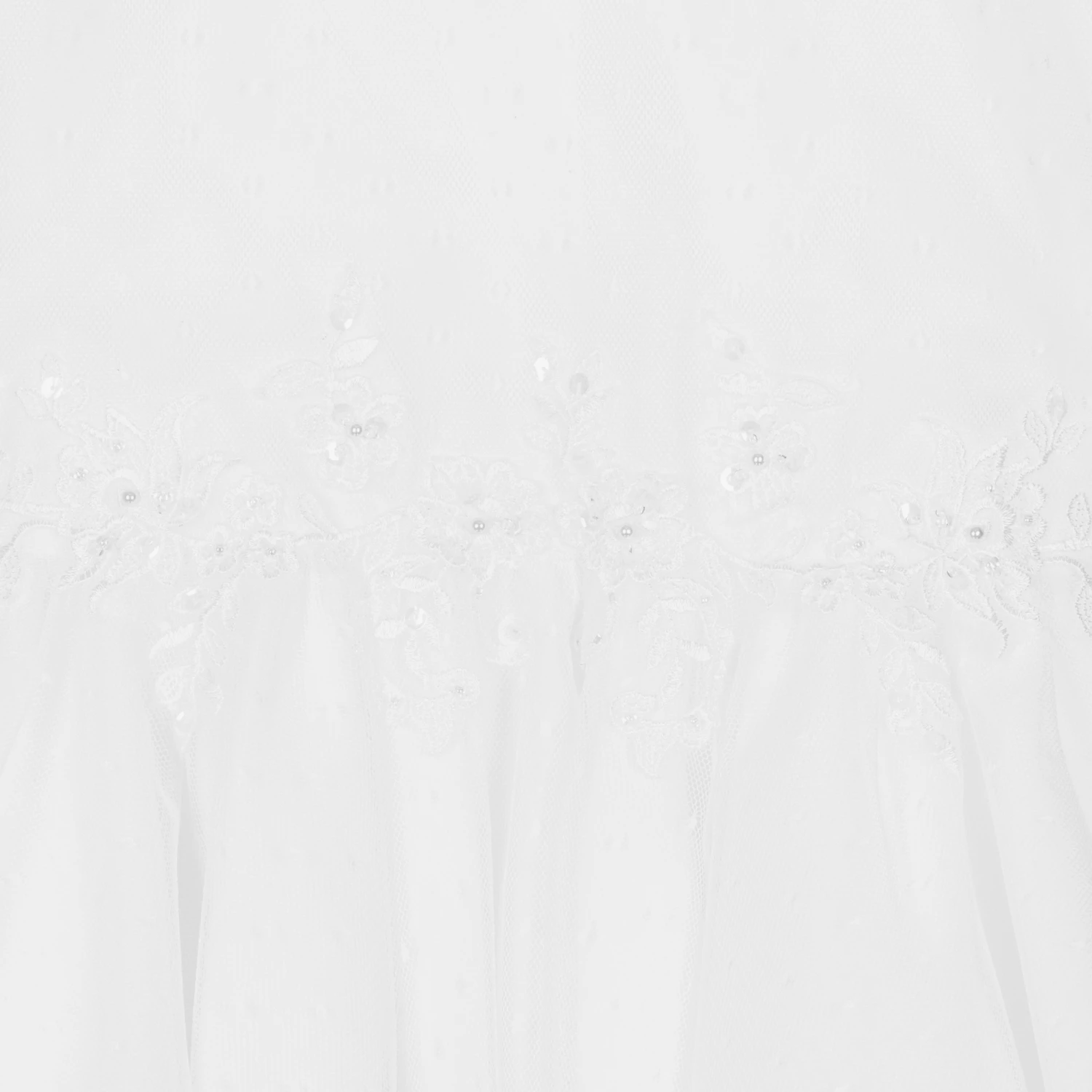 A beautiful white special occasion dress for girls by Sarah Louise. This romantic design features a sumptuous satin bodice, overlayed with a delicately patterned tulle. The dropped waist is accentuated by the floral appliqué, which is appliquéd with small faux pearls. The full skirt is generously layered and the silky lining is trimmed with stiff tulle for a pretty, voluminous silhouette. It fastens with a concealed zip on the back.