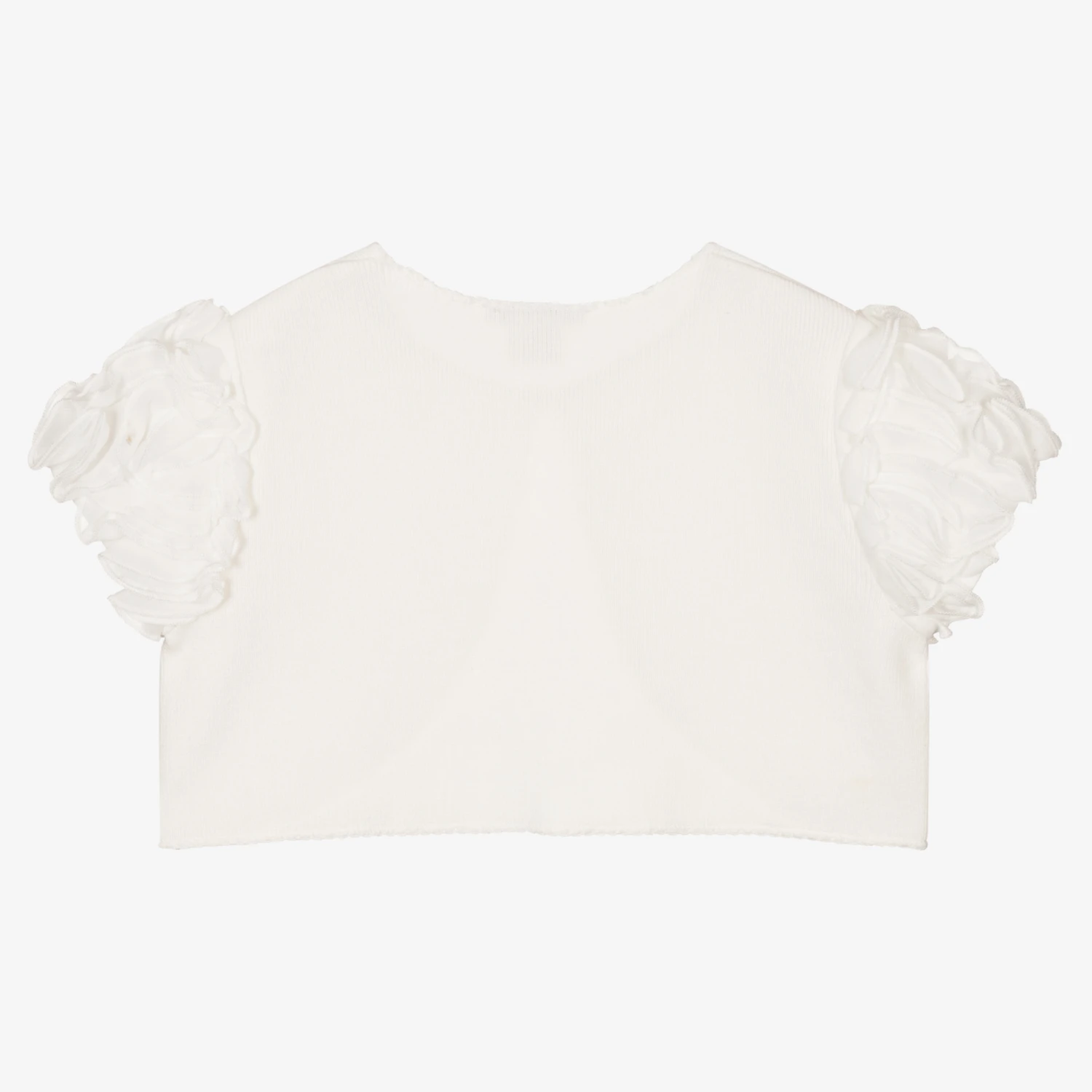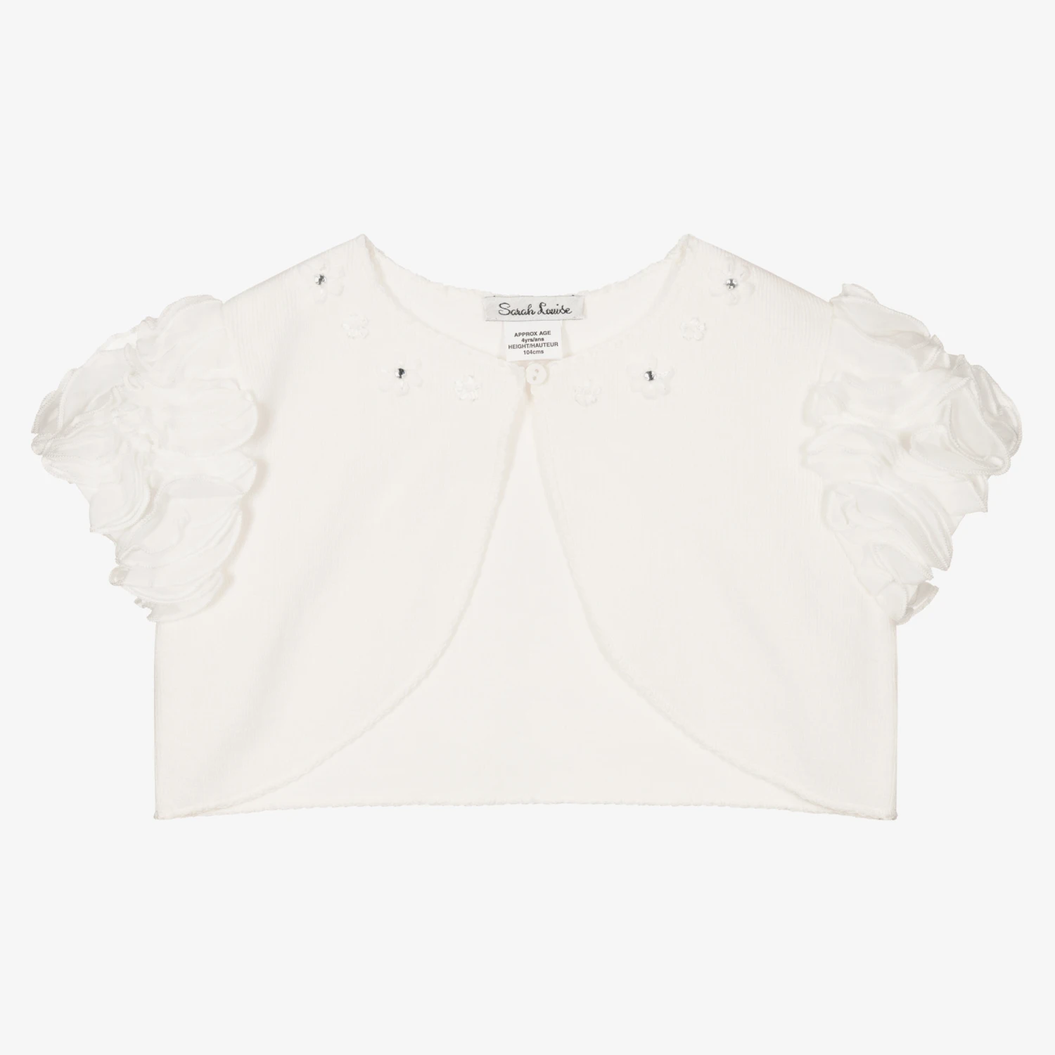 Beautiful ivory bolero cardigan for girls by Sarah Louise, with pretty ruffled voile on the short sleeves. Knitted in soft and breathable lightweight cotton, this cropped style has embroidered flowers with diamantés around the neckline, a single button fastening, and a lovely shaped front.