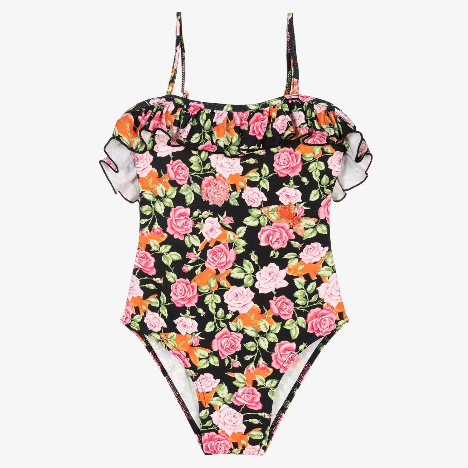 Girls black swimsuit from Selini Action, with an eye-catching rose and goldfish pattern in pink, green and orange. It has a pretty feminine ruffle around the top and shiny beaded detail on the front. Silky smooth and stretchy, the swimsuit is lined at the front and has narrow adjustable shoulder straps.