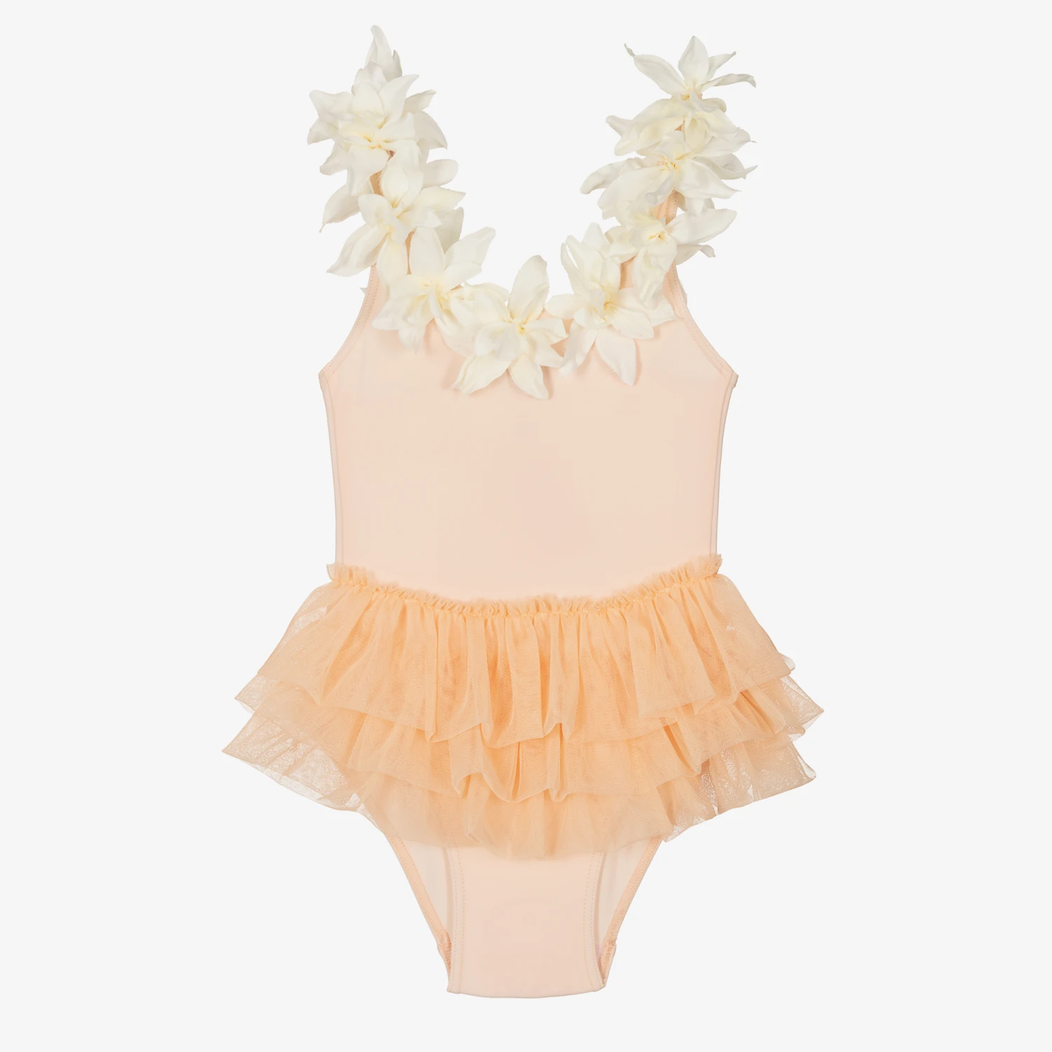 A beautiful pink swimsuit for girls from Selini Action, with pretty fabric flowers hand-sewn around the neckline and straps. So adorable, there are tiers of soft tulle frills to create a tutu skirt effect. It is silky smooth and stretchy with a lining on the front side for added comfort.