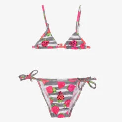 Grey and white striped bikini for girls by Selini Action, with a pink strawberry print and pretty bead embellishments. Silky, stretchy and lined for comfort, the briefs have cute tie detail at the sides and the top has adjustable shoulder straps and a plastic clip fastening at the back.