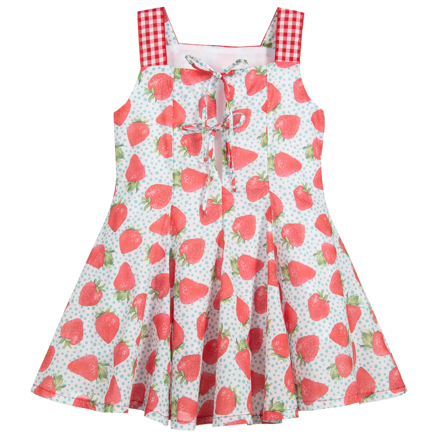 Sweet sun dress for girls by Selini Action, printed with red strawberries and pale blue dots. Made in ivory cotton, it has red gingham trims with sequin and bead detailing on the bodice. Fully lined, the dress is paneled, giving a pretty flared skirt and fastens with little ties on the back.