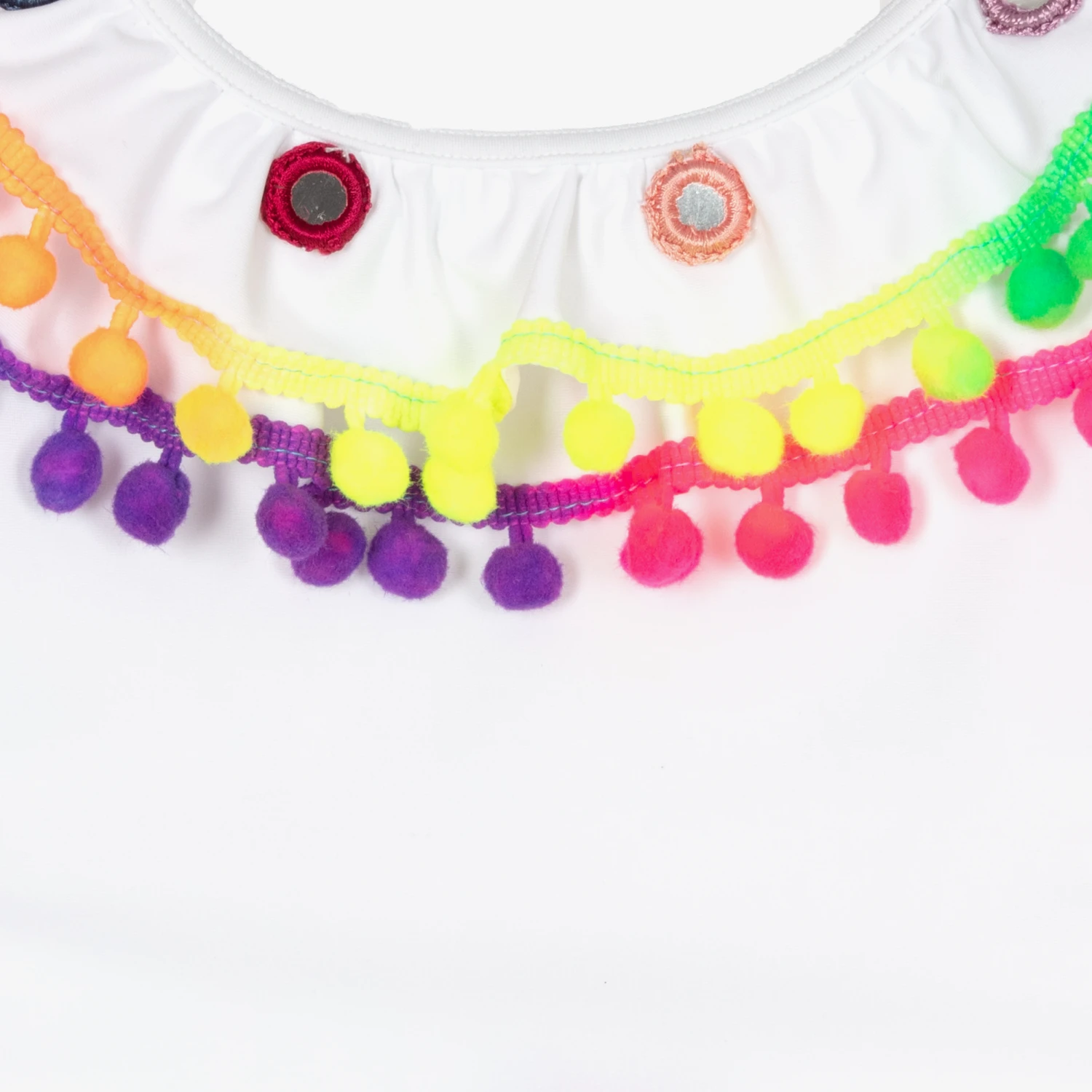 Girls bright white swimsuit by Selini Action. Decorated with colourful pom-poms and mirrored discs, this vibrant design has adjustable shoulder straps and is fully lined.