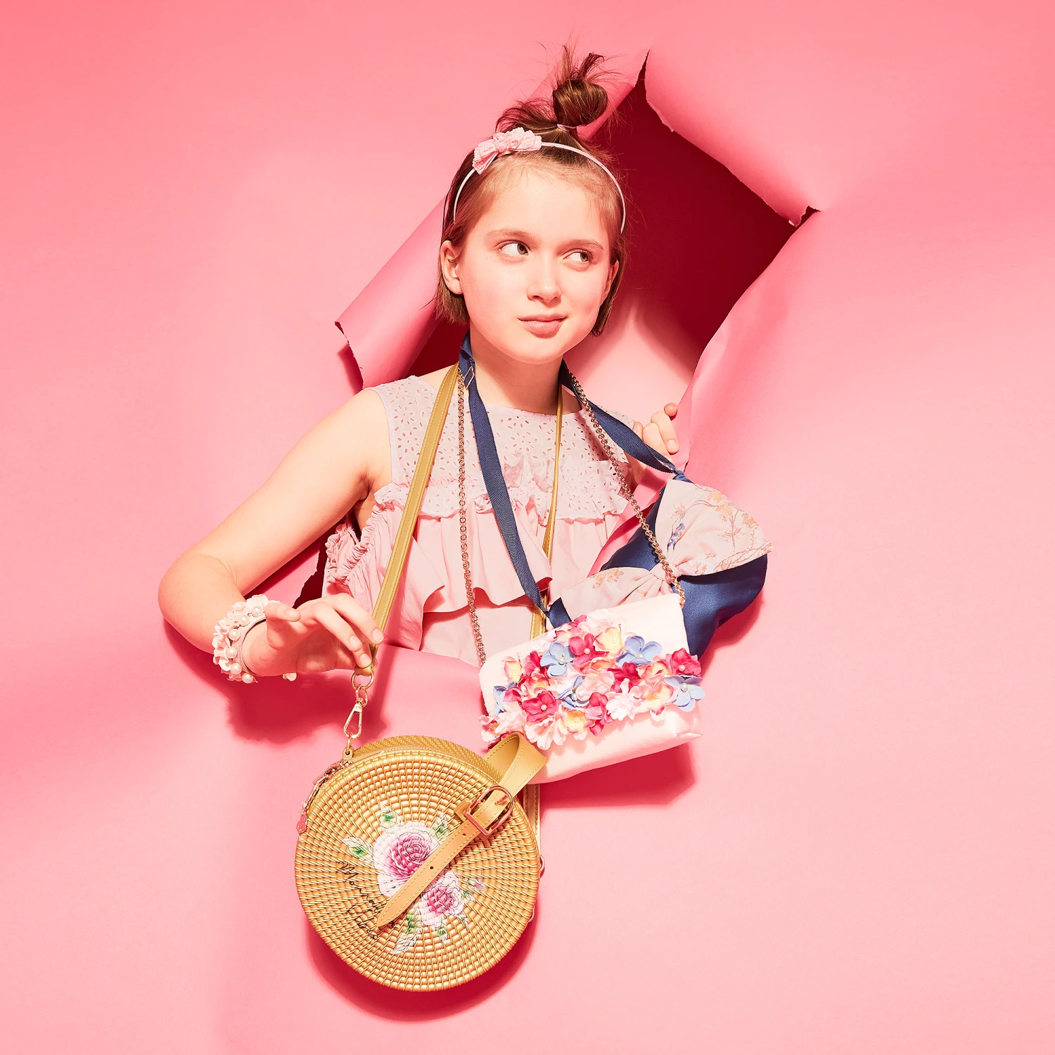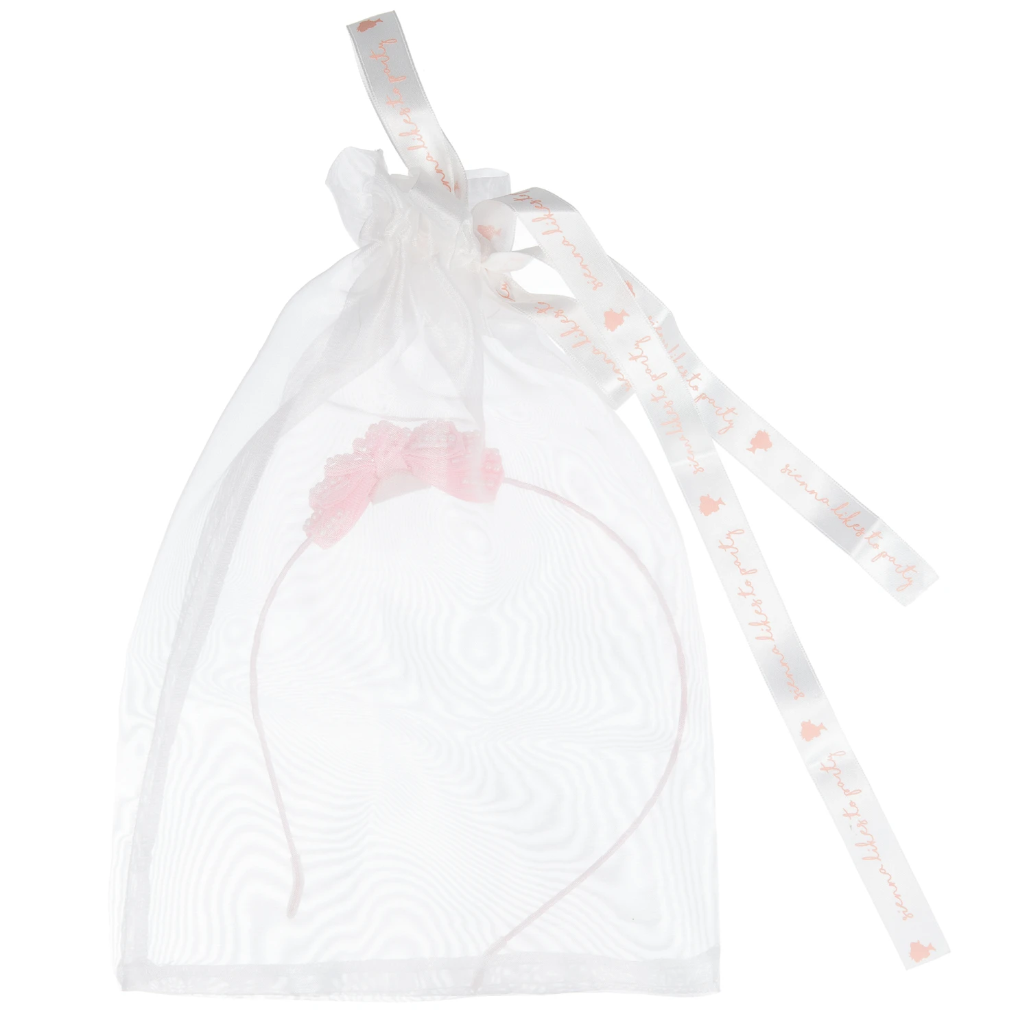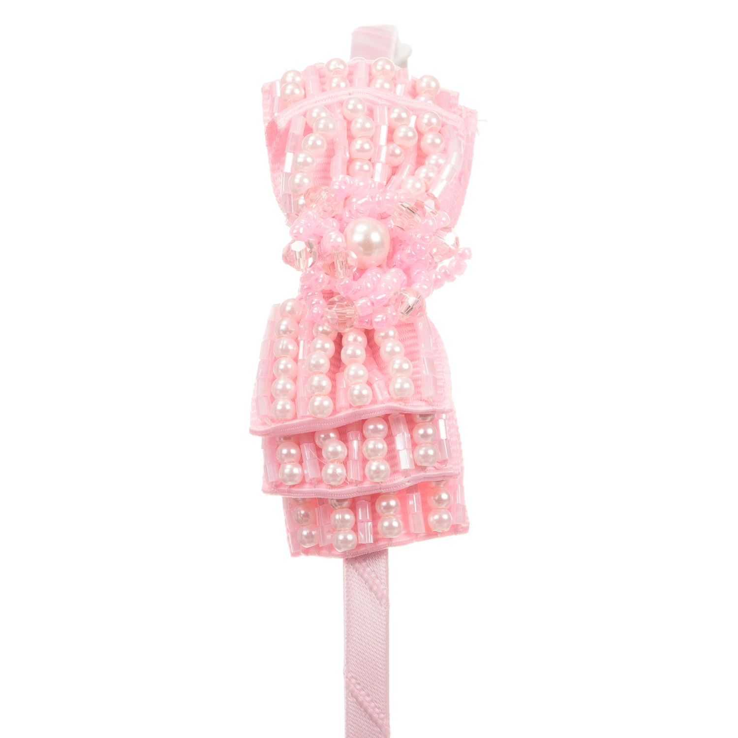 Girls handmade pink satin covered hairband by Sienna likes to party. The pretty bow is covered with shimmery clear and pearl beads.