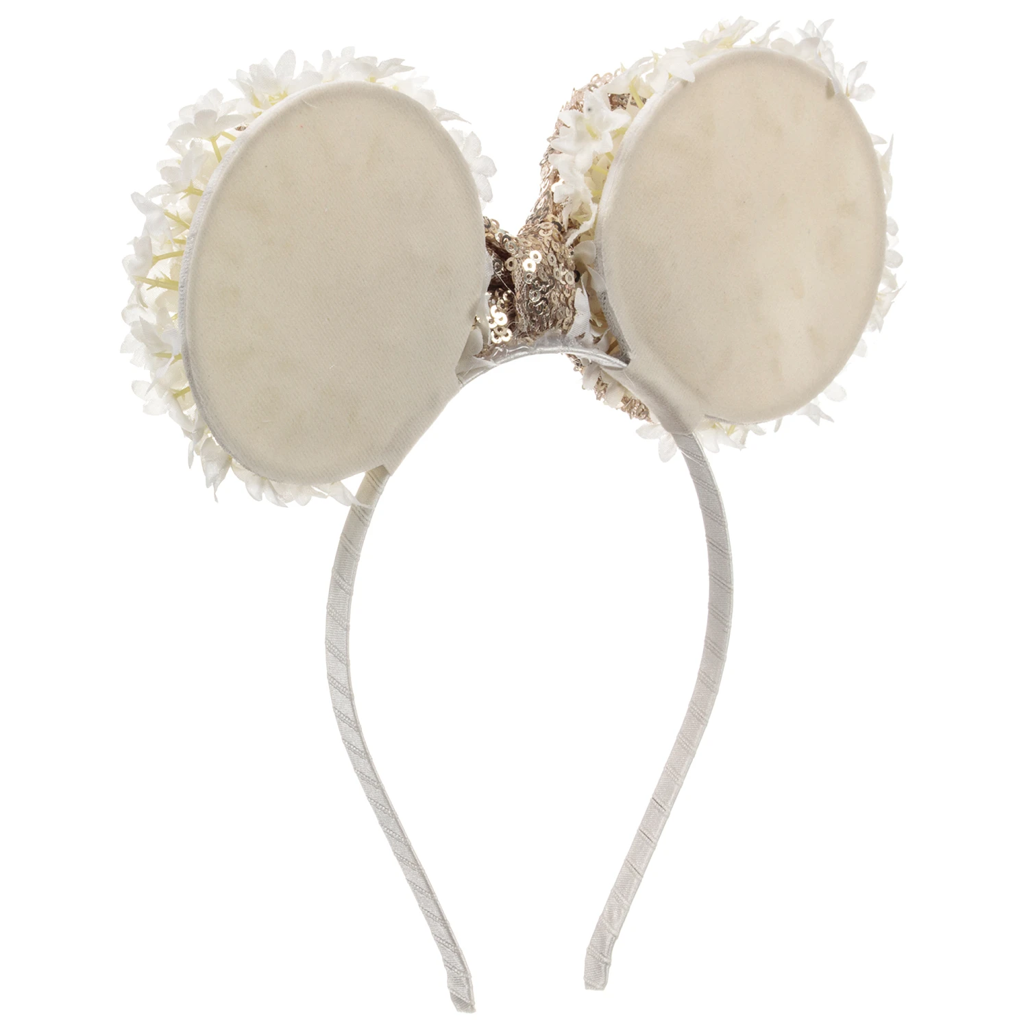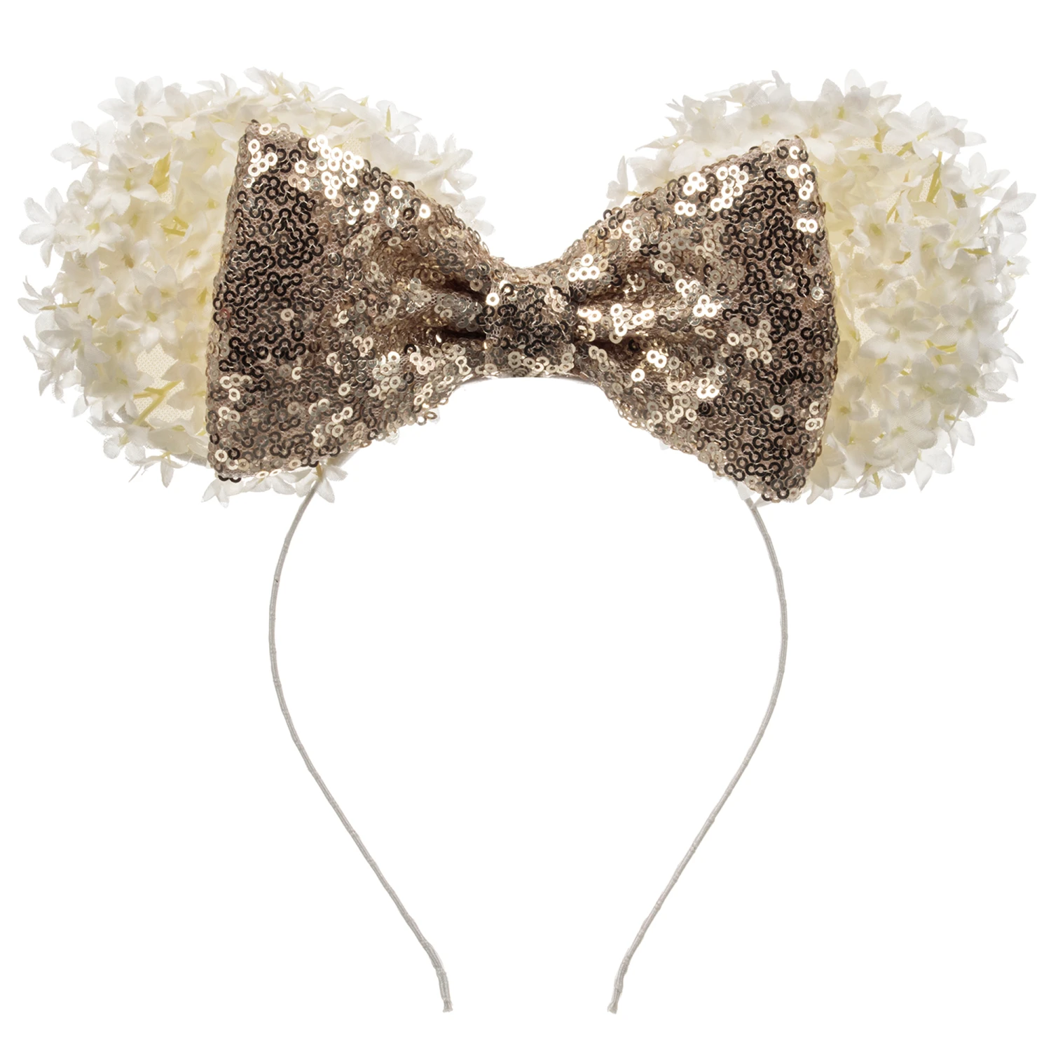 Girls special occasion gold sequin and floral hairband from Sienna likes to party. The flowers are handmade. The band is made from stainless steel and covered in polyester satin.