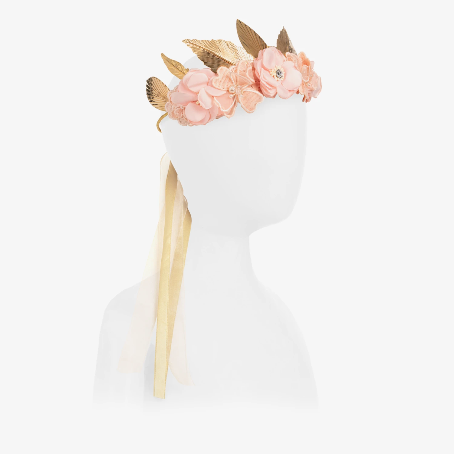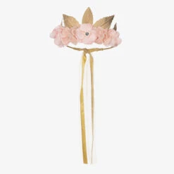 Stunning pink and gold garland hairband for girls by Sienna likes to party. Beautifully handmade, the satin-covered flexible band is decorated with delicate pink fabric flowers, embellished with rhinestones and faux pearl beads. It is accentuated with shiny gold plated metal leaves in a crown style for a statement look. The organza and satin ribbon ties on the back keep it in place on the head.