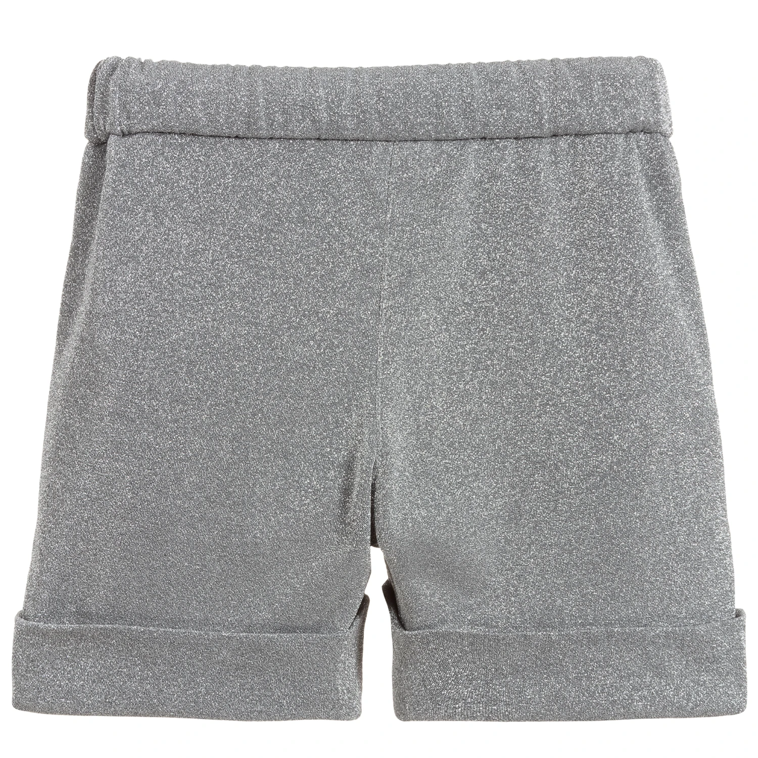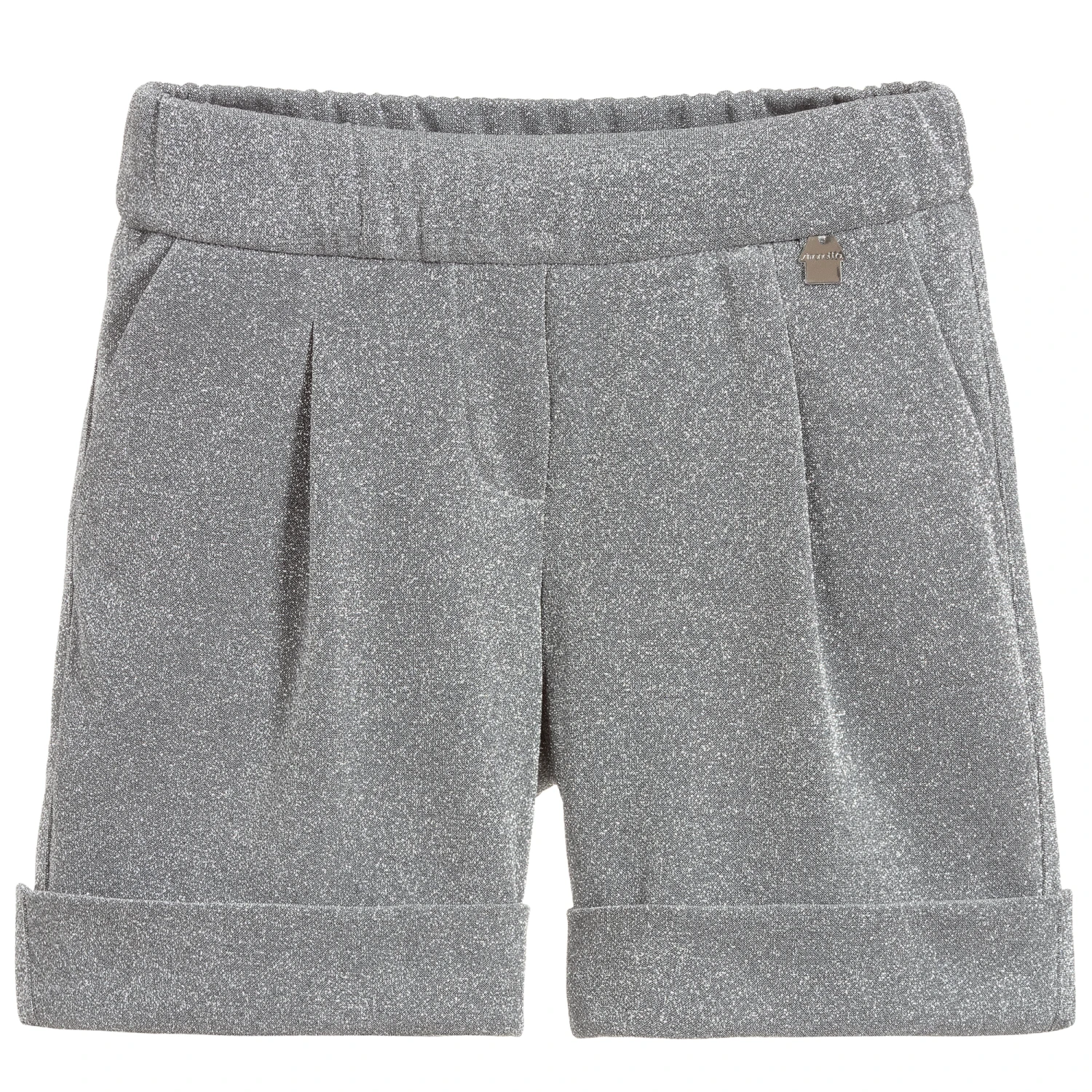 A fabulous pair of glittery silver shorts for girls by Simonetta. Made in a comfortable and stretchy viscose and lurex blend, they have an elasticated waistband, side pockets and turn-ups.