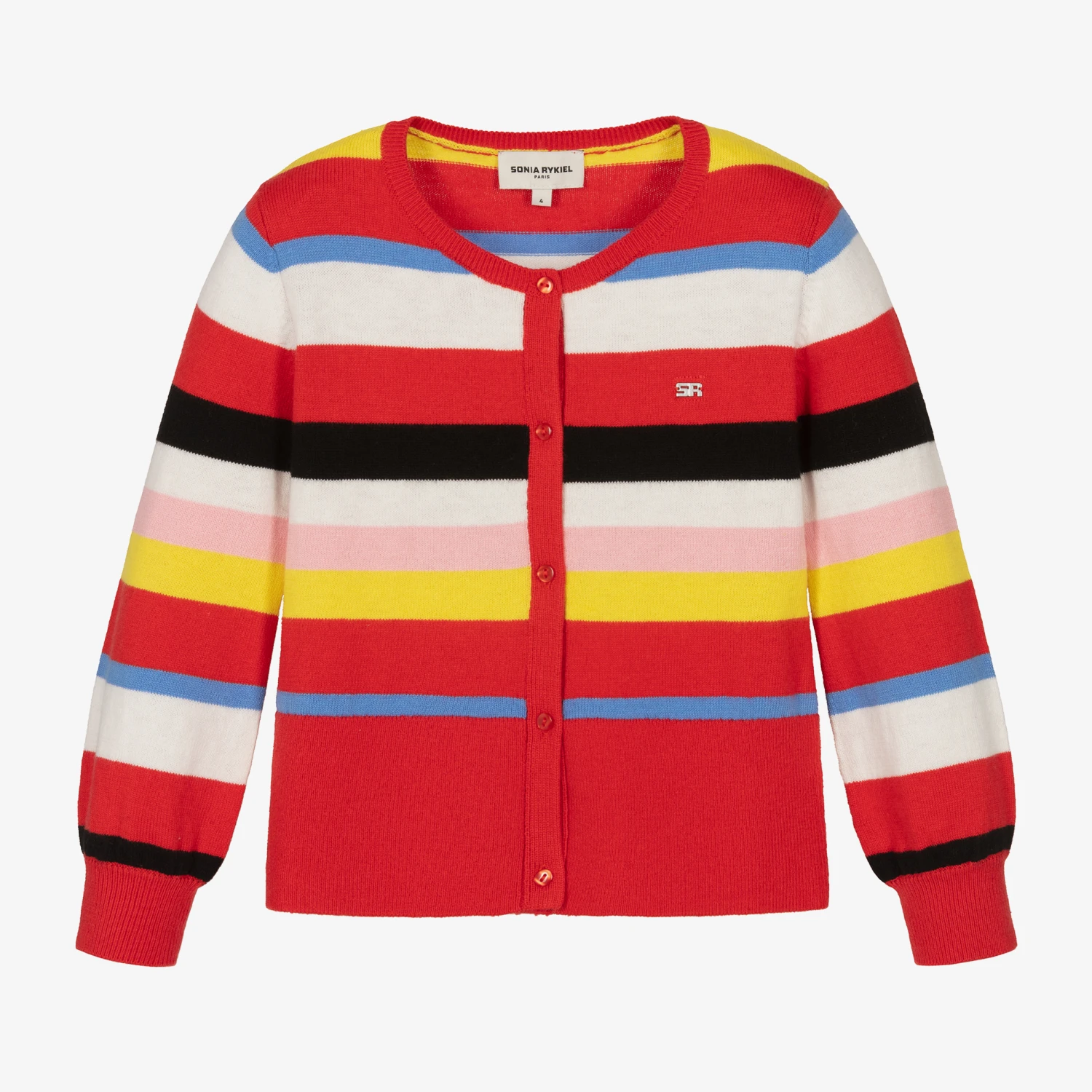 Colourful striped cardigan for girls by Sonia Rykiel Paris, made in a super soft and comfortable cotton blend. Ideal as an extra layer on slightly cooler days, it has a metal logo on the chest, ribbed trims and button fastenings on the front.