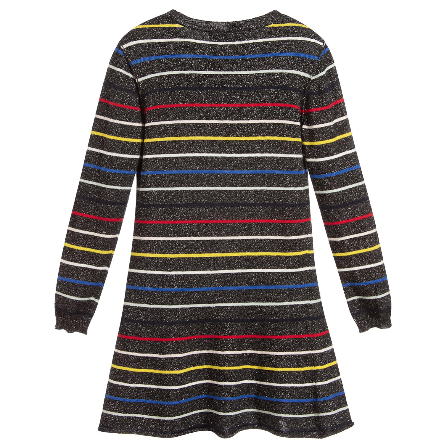 Girls glittery grey sweater dress by Sonia Rykiel Paris, with colourful stripes. It is knitted in a lightweight wool and cotton blend, with a logo design on the chest.