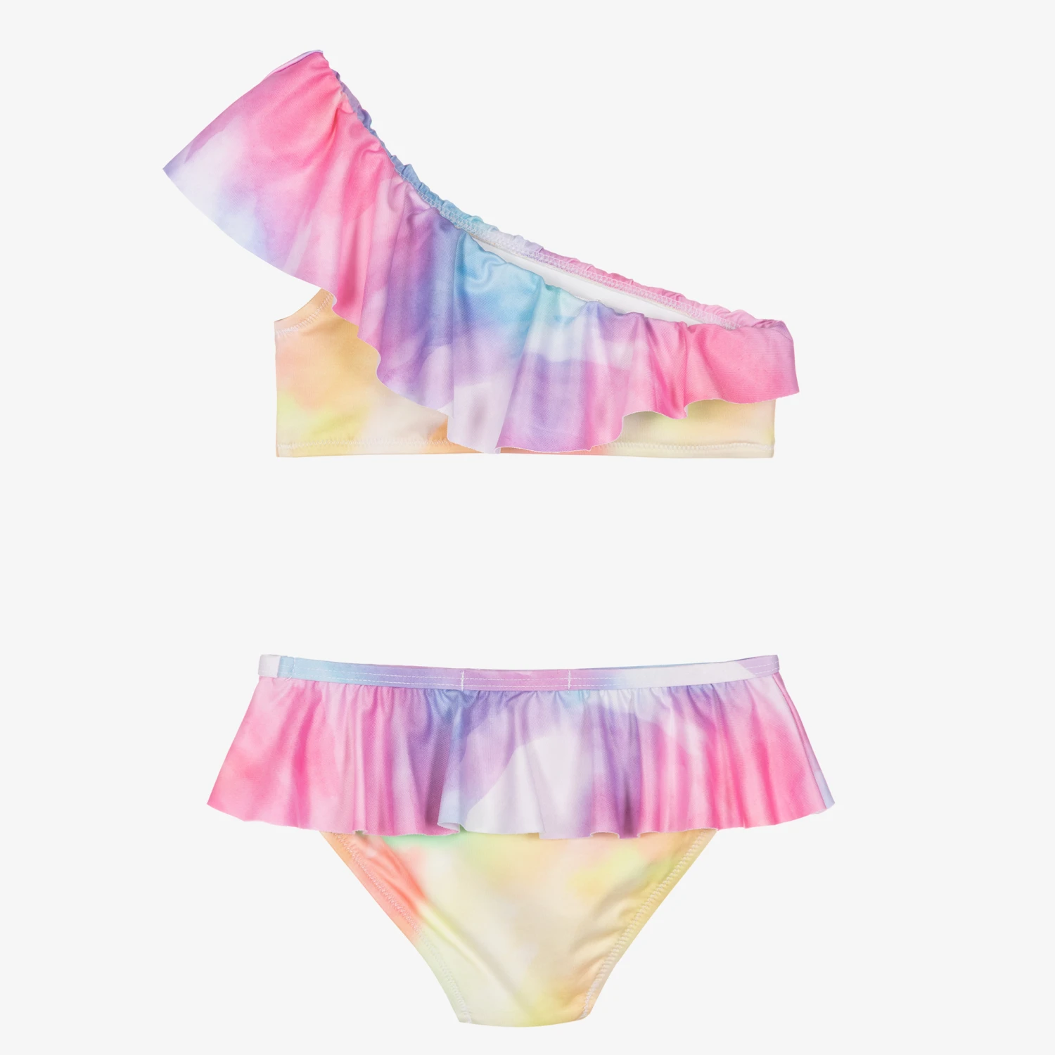 In multicoloured pastel hues, this ombre-patterned bikini for girls is by Stella Cove. Pretty and dreamy, the top comes in a fun one shoulder style, with ruffled trims. This bikini is smooth, stretchy and fully lined for comfort.