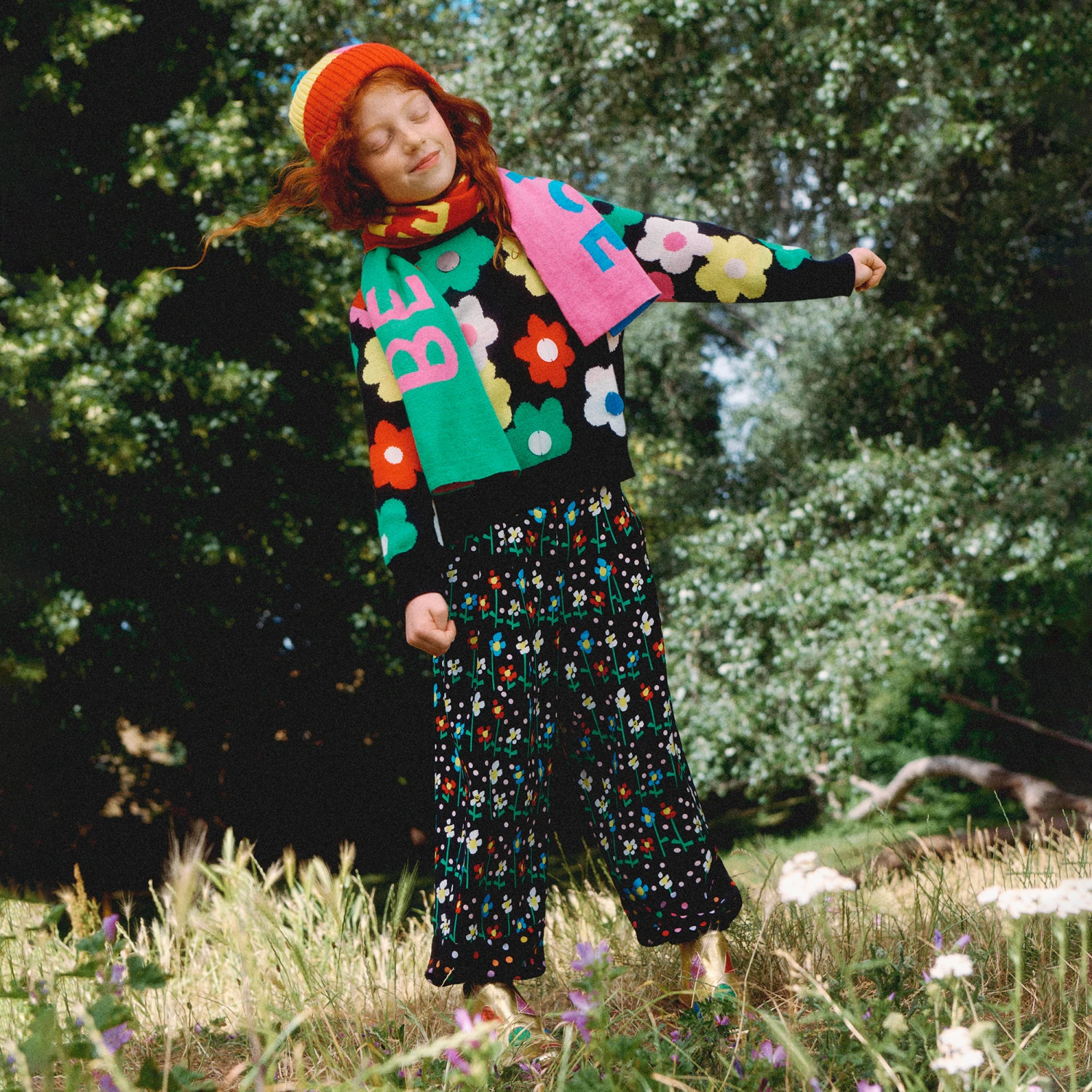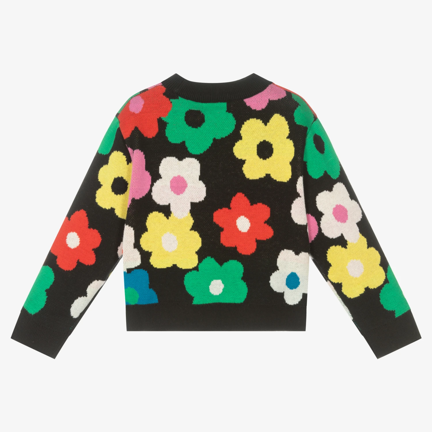 Wonderful black sweater for girls from Stella McCartney Kids, knitted from soft organic cotton, with a hint of wool. In the designer’s true style, this sweater is wonderfully accented with colourful flowers and large sequins for an on-trend aesthetic.