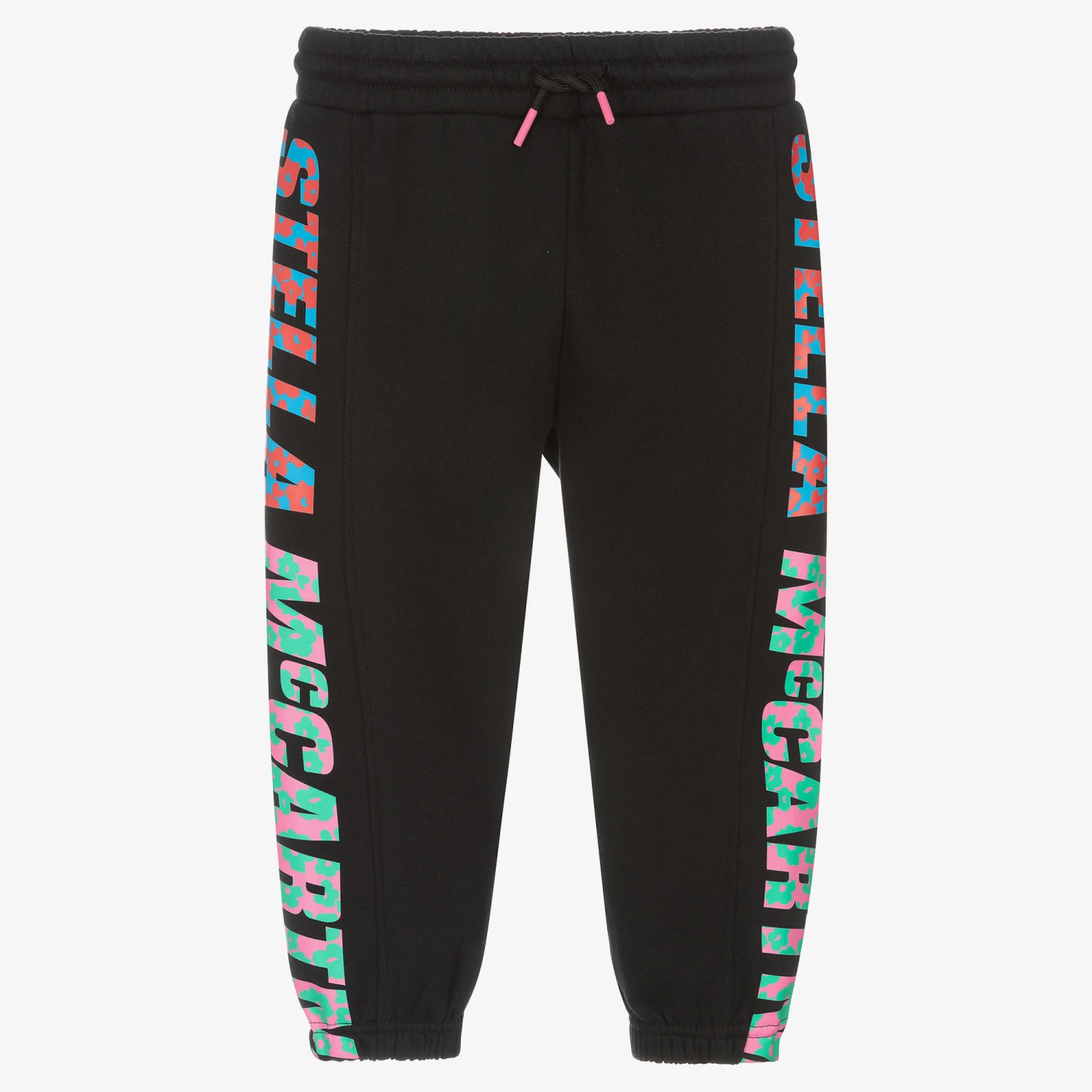 Girls black joggers by Stella McCartney Kids, with colourful logo taping print at the sides. Made in mid-weight organic cotton sweatshirt jersey, these easy-wearing joggers have an adjustable drawstring waist and elasticated cuffs.