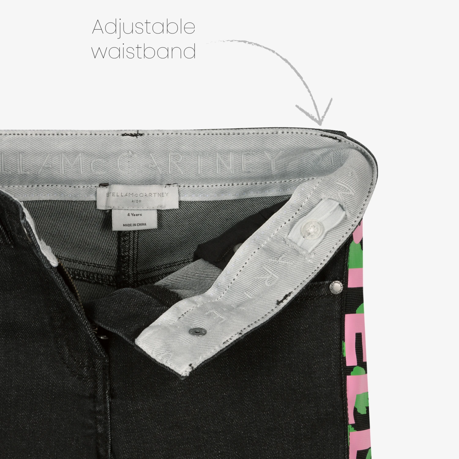 Washed black skinny jeans for girls by British designer, Stella McCartney Kids. Made in soft organic cotton denim with a slight stretch for comfort, this classic five pocket style has stand-out side trim, with bold pink logo prints on a black and green patterned background. The adjustable waist has a logo tab at the back and the jeans fasten with a zip and hook. The Stella McCartney fit can be quite small so choose a size up if you want room to grow.