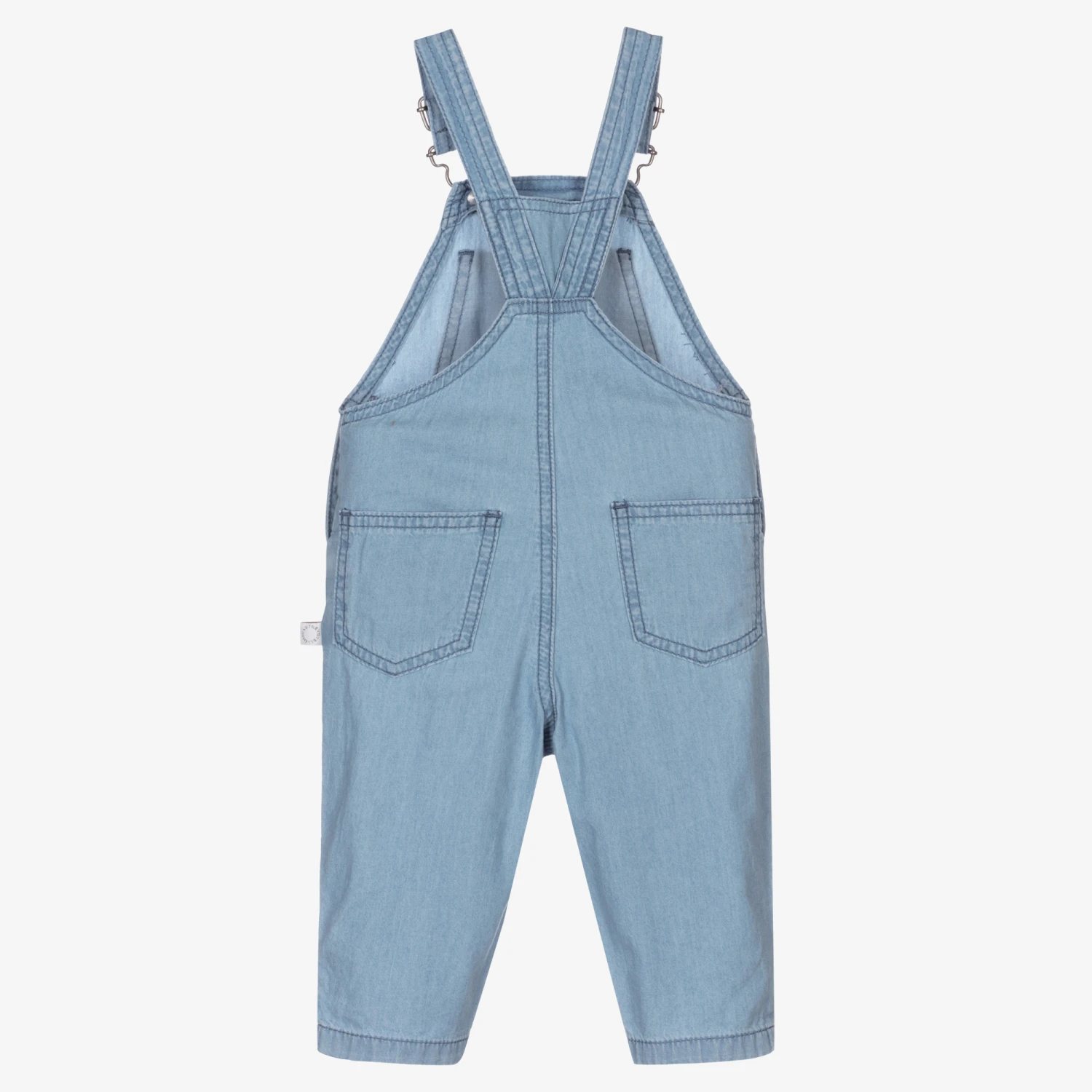 Blue dungarees by Stella McCartney Kids, made in soft and lightweight cotton chambray. The front is embroidered with colourful fruit and flowers and they have button fastenings on the sides and adjustable clip fastening shoulder straps. They have five useful pockets.