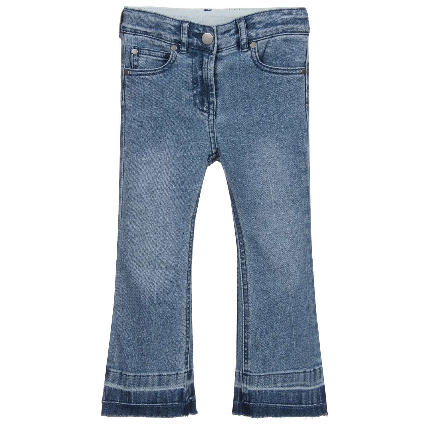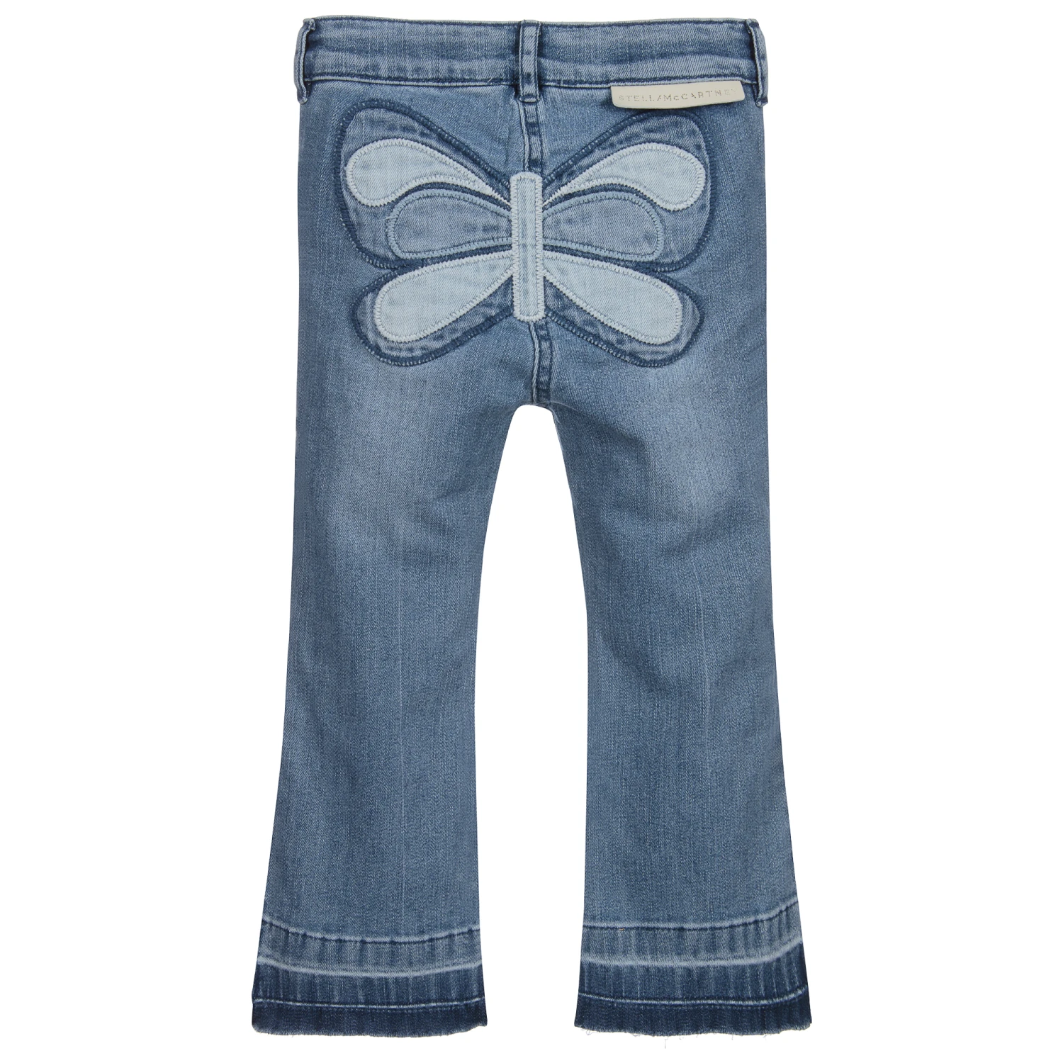 Girls blue flared denim jeans by Stella McCartney Kids, made in sustainable cotton. They have a butterfly detail on the back and the hems have a worn and faded look with raw seams. There is a zip and hook fastening on the front with a useful adjustable waist.