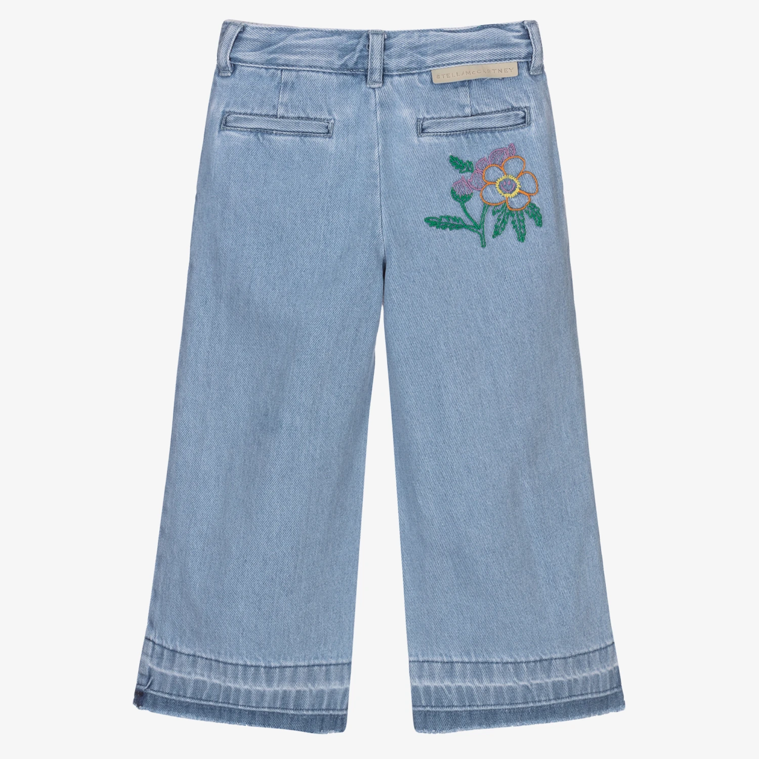 Blue denim wide-leg jeans for girls by British brand Stella McCartney Kids, with colourful floral embroidery. They are made in mid-weight organic cotton with a washed and worn look. The adjustable waistband has a logo tab around the back and the frayed cuffs give the appearance of having been let down.