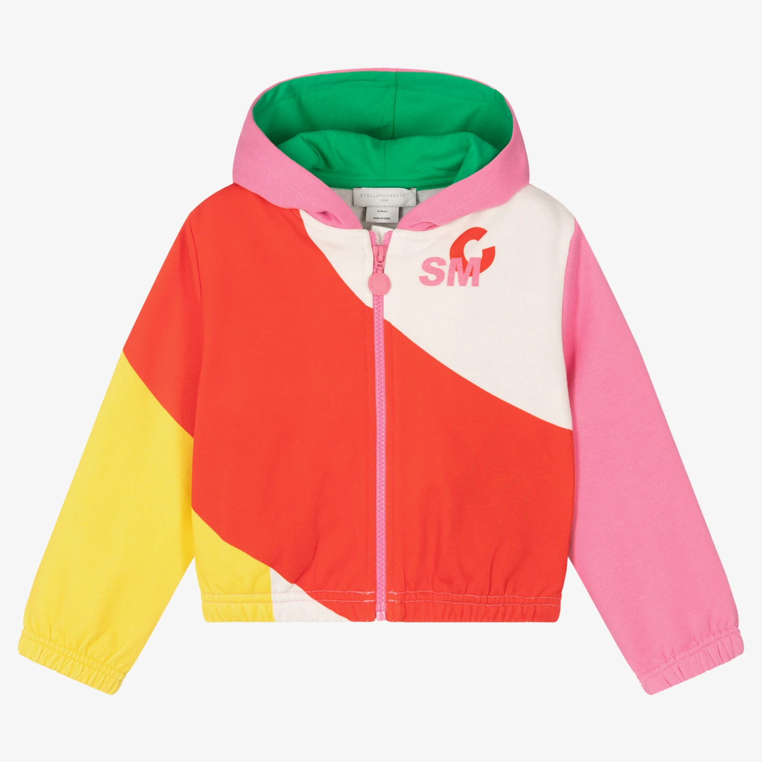 Girls short, colourblock zip-up hoodie by Stella McCartney Kids, with the SMC logo printed on the chest. This vibrant look has a pink zip with a medallion logo zip pull and concealed pockets on the side seams. Soft and fleecy on the inside, it is made in mid-weight organic cotton jersey with elasticated hem and cuffs for extra