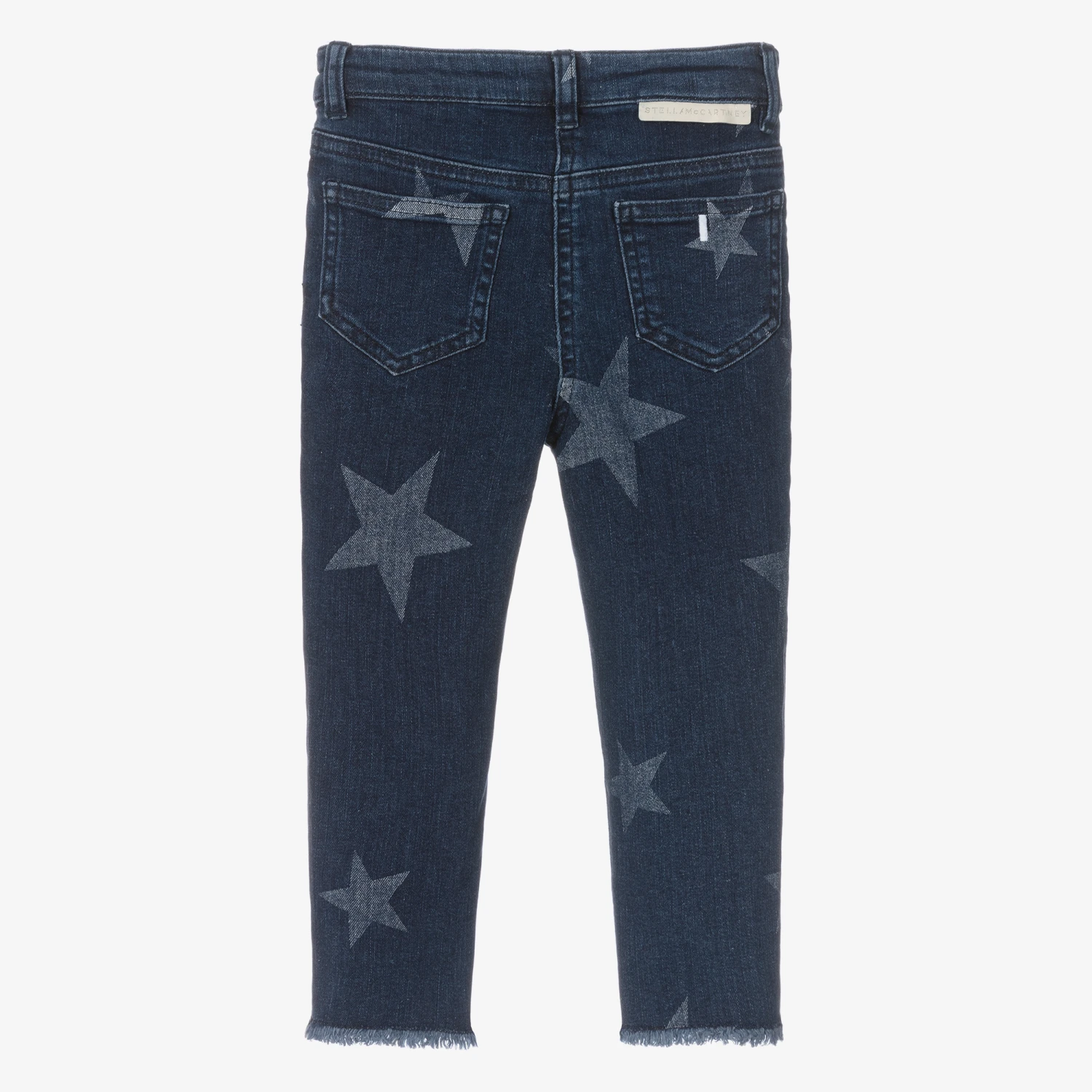 Grey and blue skinny jeans for girls by Stella McCartney Kids, made in organic cotton denim with a comfortable stretch. Patterned with a fun star print on the front and back, they have frayed cuffs, classic five pocket styling, and a useful adjustable waist for a great fit.