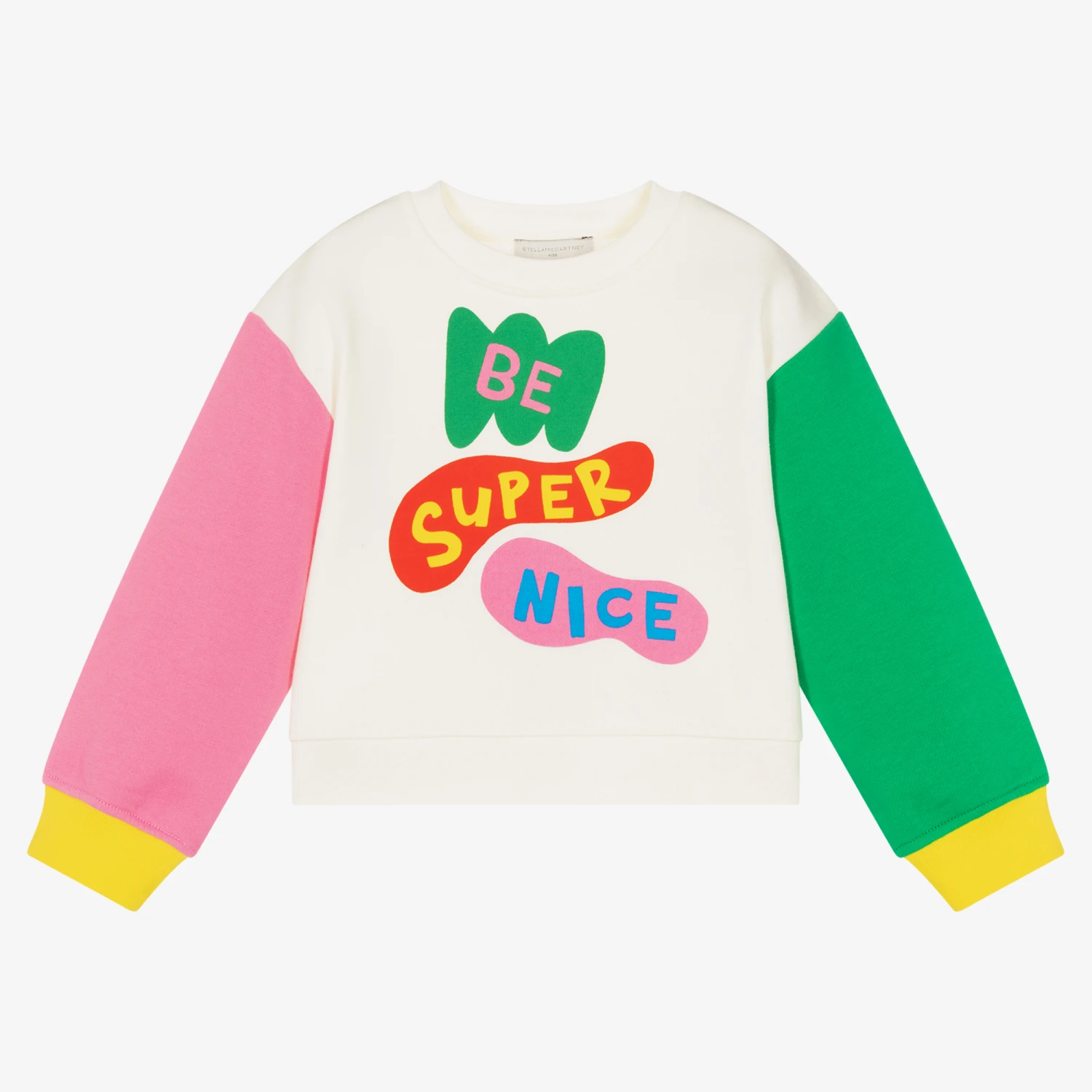 An oversized, colourblock sweatshirt for girls by Stella McCartney Kids, made in organic cotton jersey. It has a bold, playful slogan print on the front with contrasting pink and green sleeves. The dropped shoulders and cosy ribbed trims make for a casual and relaxed look.