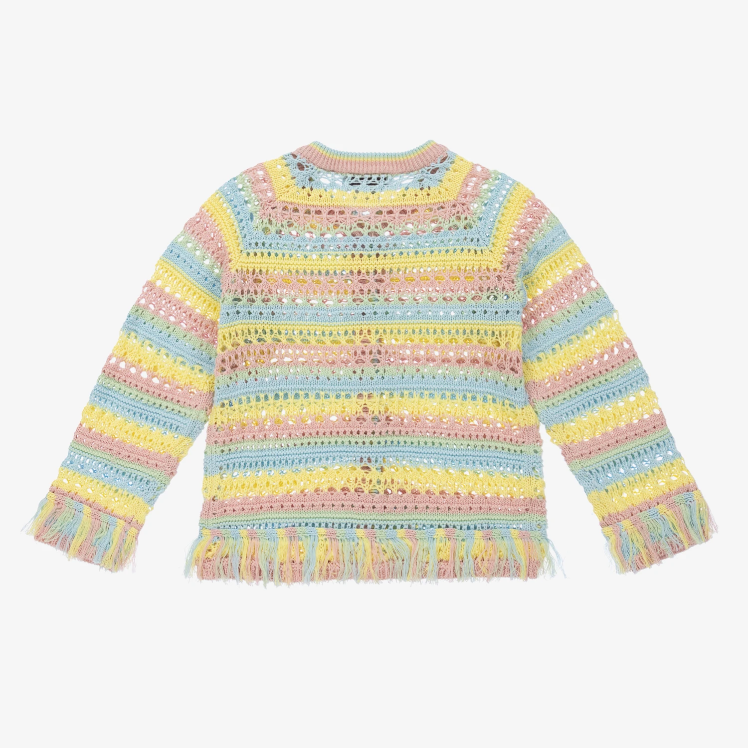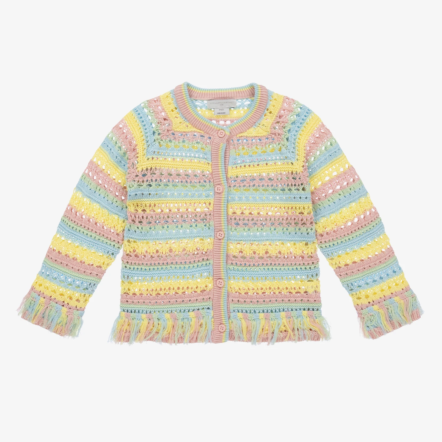 In pretty pastel shades, this rainbow striped cardigan for girls is by Stella McCartney Kids. Beautifully crocheted in soft cotton, it has fun fringing detail and subtly branded button fastenings. The Stella McCartney fit can be quite small so choose a size up if you want room to grow.
