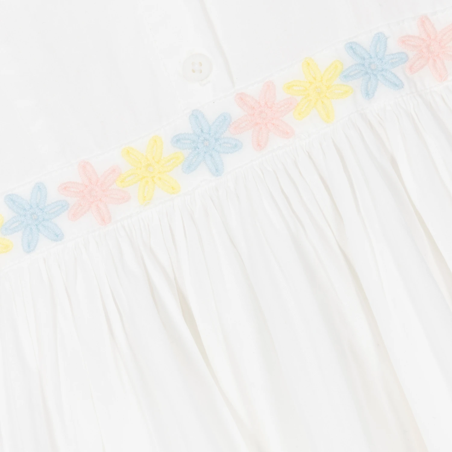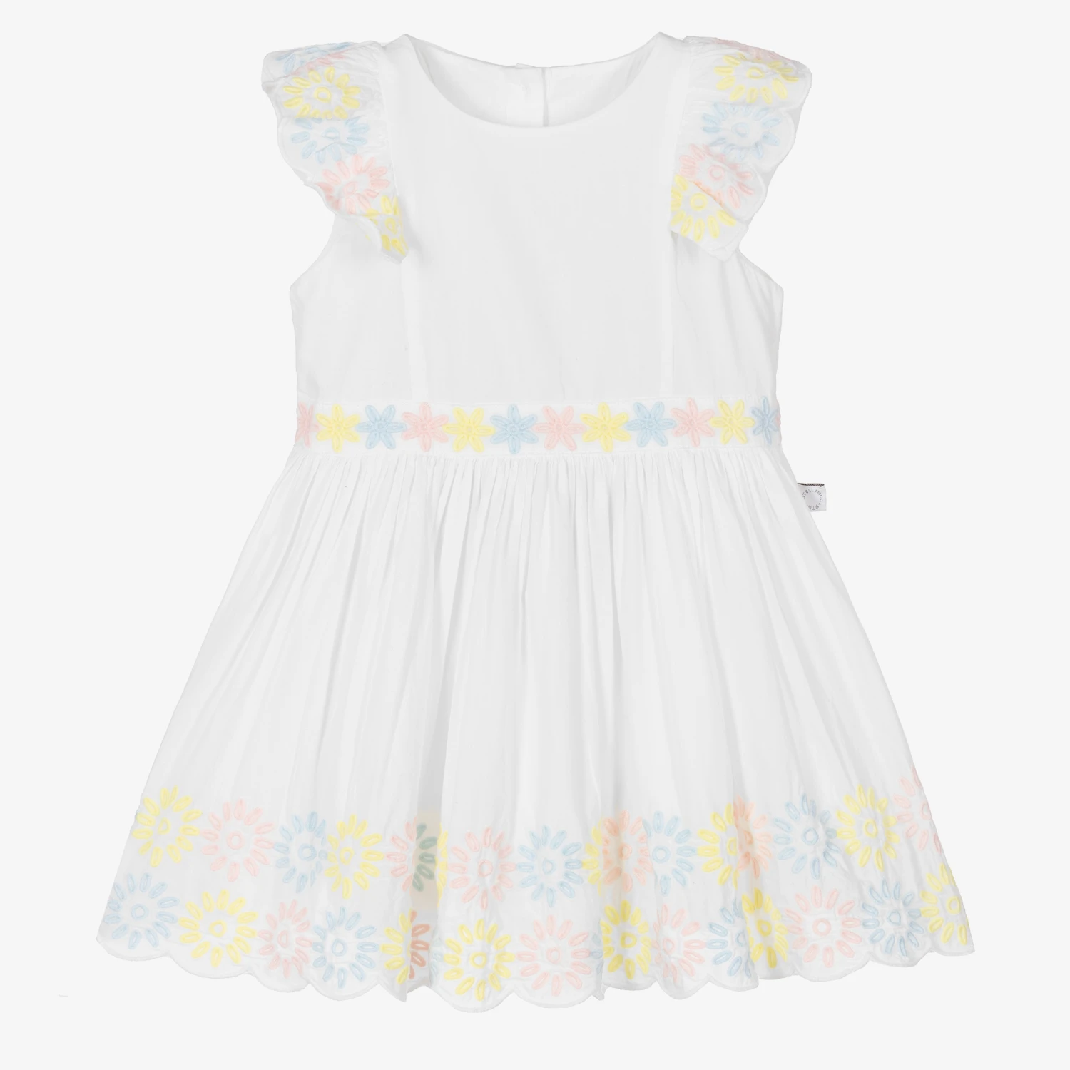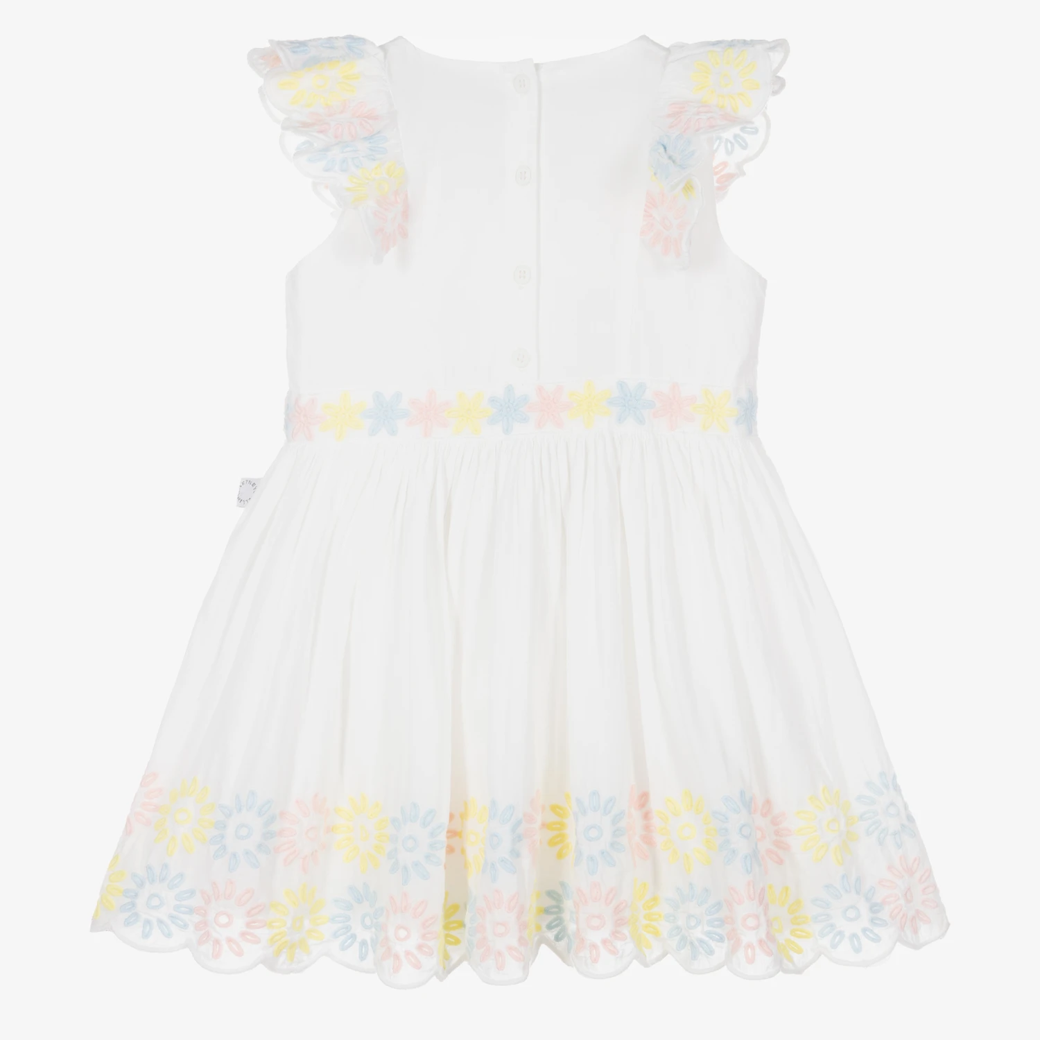 Charming dress for little girls by British brand Stella McCartney Kids, made in lightweight organic cotton. This beautifully feminine dress has pale pink floral embroidery on the frilled shoulders, around the waist and along the hem. The skirt is gathered at the waist and flares out creating a lovely shape and movement. Branded button fastenings on the back give a subtle designer touch. The Stella McCartney fit can be quite small so choose a size up if you want room to grow.
