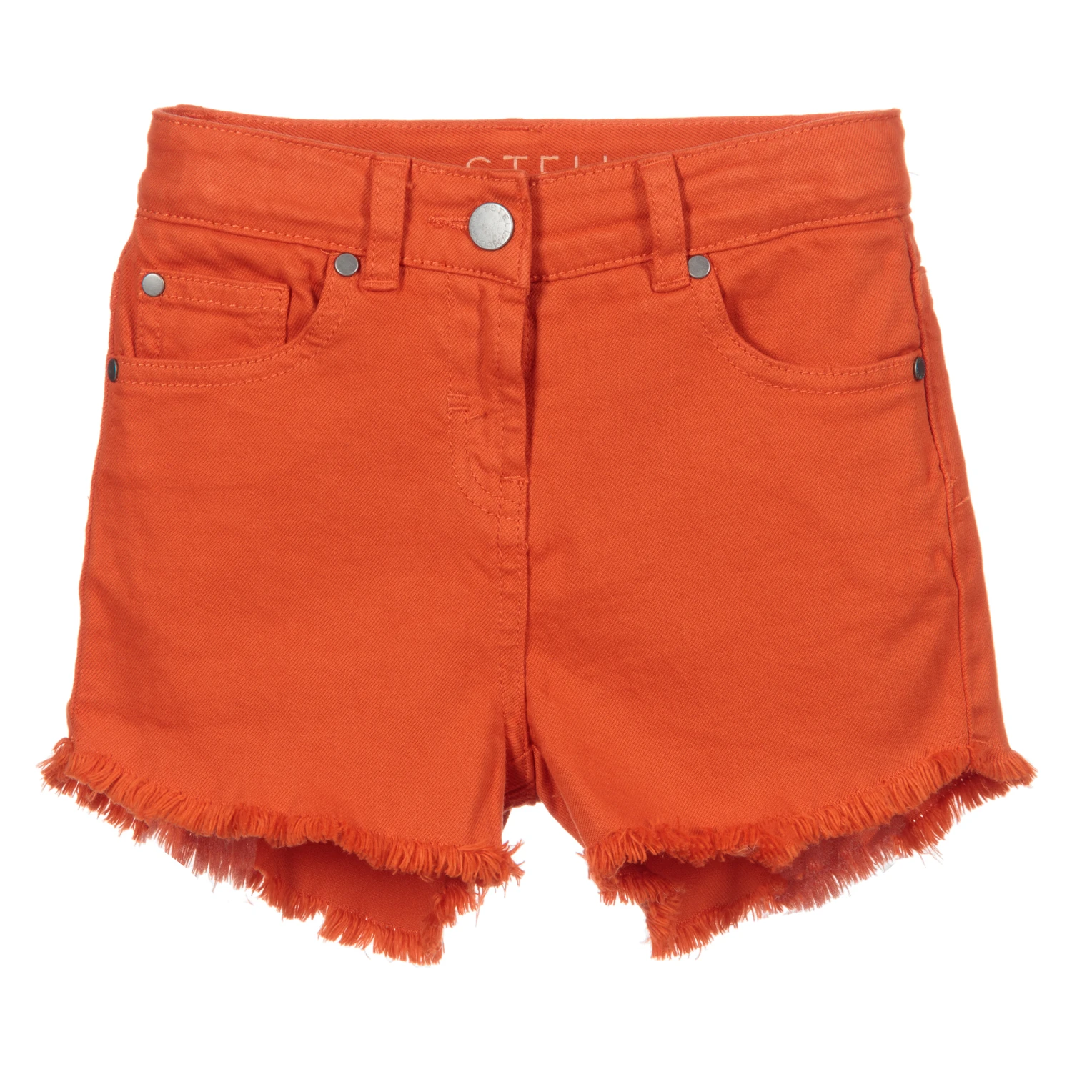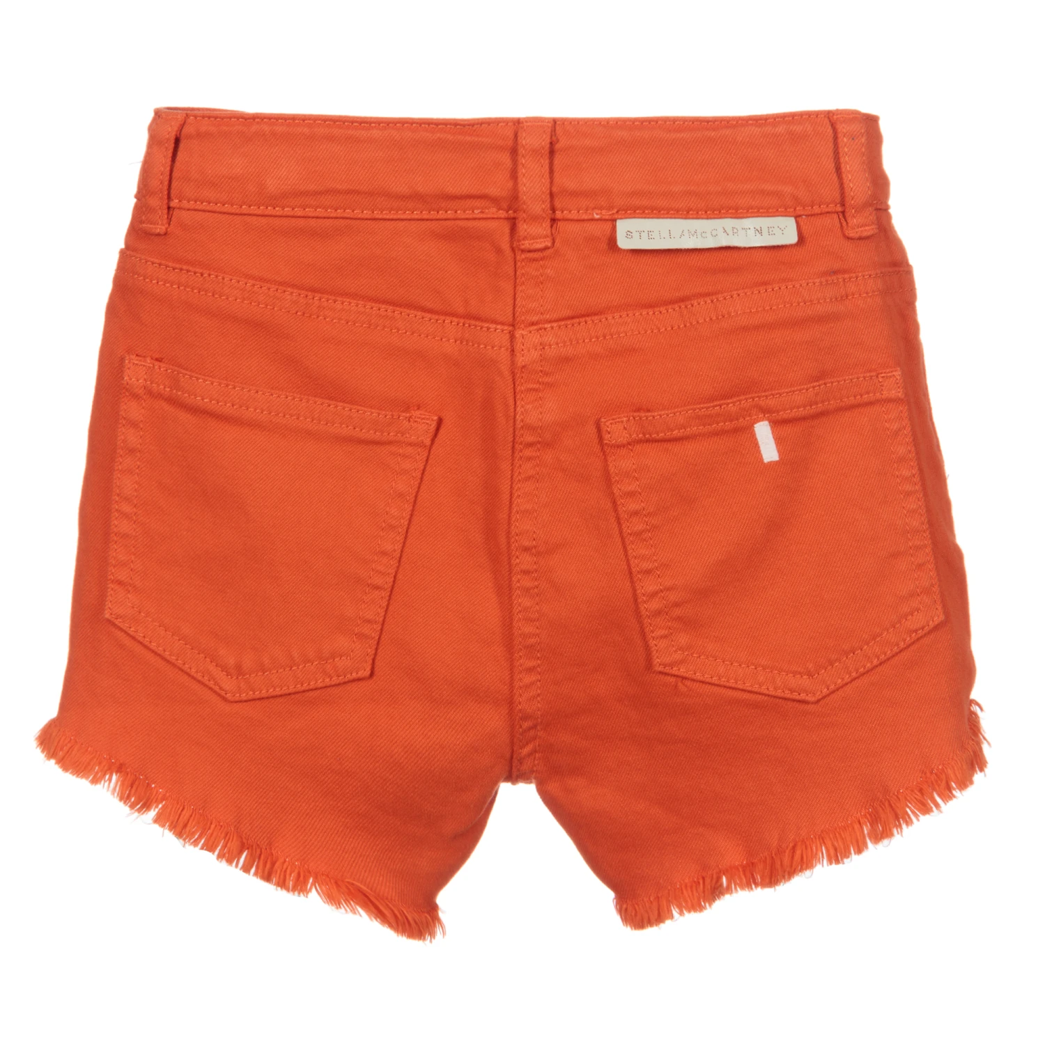 Girls flame orange cotton denim shorts with frayed edges by Stella McCartney Kids. There is a beige logo tab on the back and a white embroidery detail on the back pocket.
