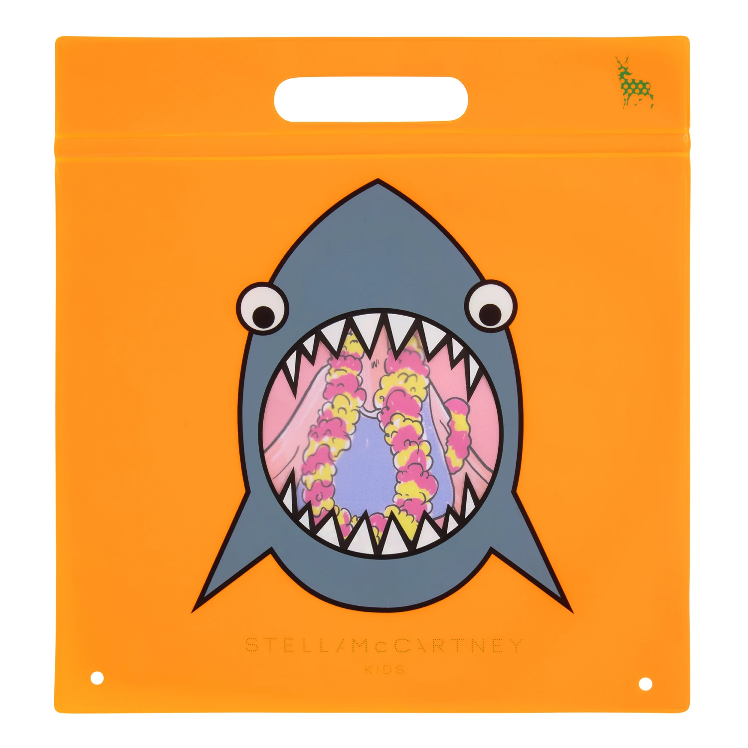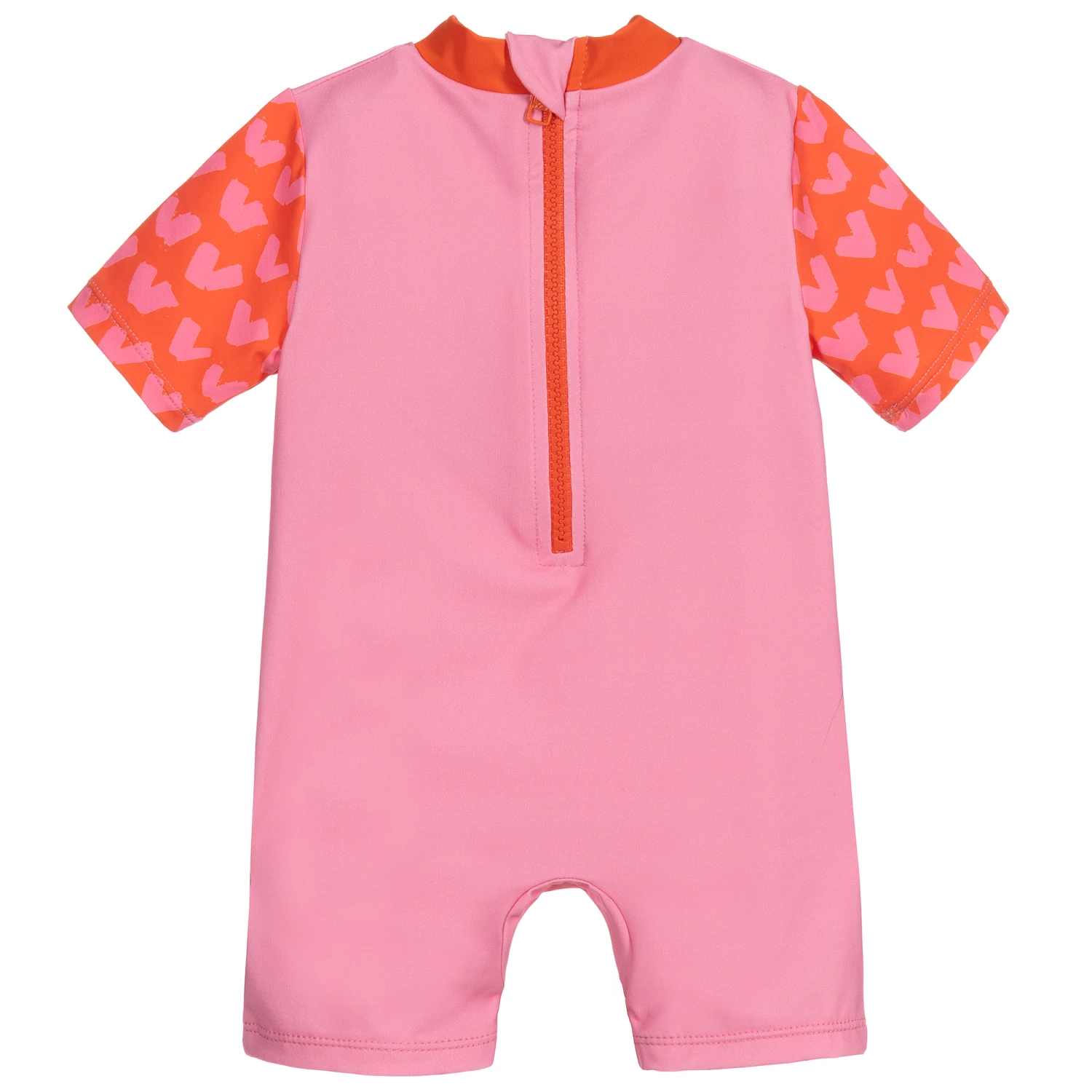 Fun pink swimsuit for younger girls by British designer Stella McCartney Kids, with a sun protection UPF 50+. Made in silky recycled nylon, it has red sleeves printed with pink hearts and the body of a flamingo printed on the front.